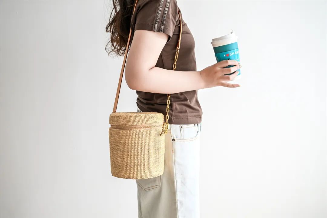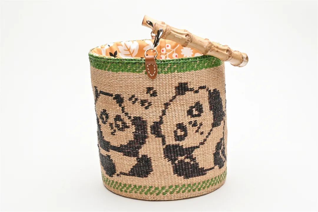 桶包系列多以素色为主,其中一款周身编有熊猫图样的桶包尤为亮眼,它以竹节作为包的手柄,形象且生动。桶包容量不容小觑,还能自由切换手提、斜背、肩背等背法。