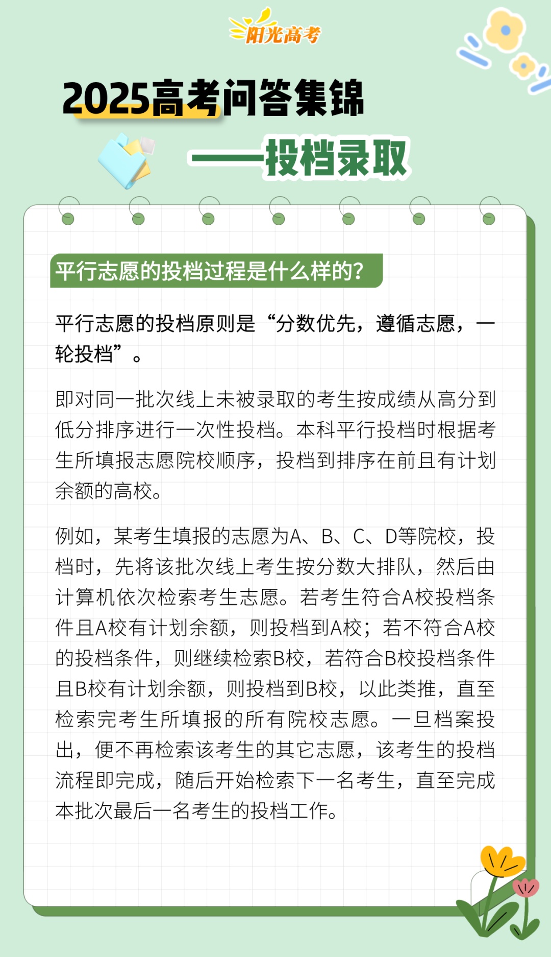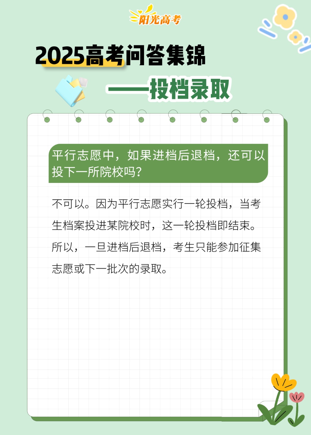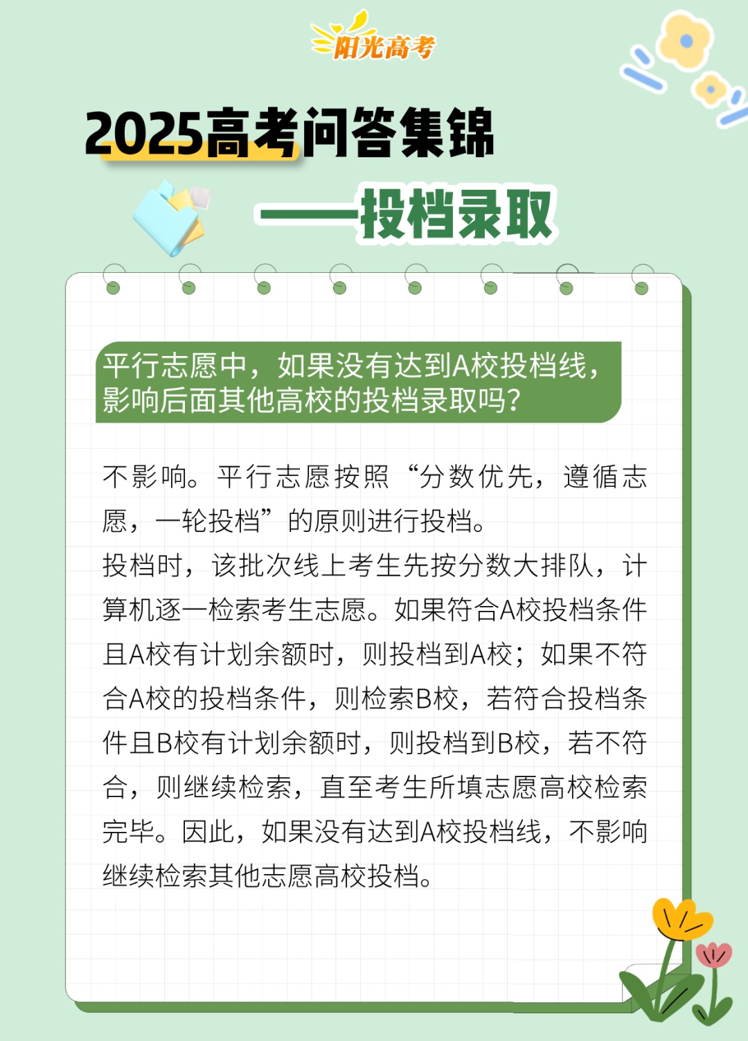 平行志愿的投档原则是“分数优先,遵循志愿,一轮投档”。那么,平行志愿中,如果没有达到A校投档线,影响后面其他高校的投档录取吗?平行志愿中,如果进档后退档,还可以投下一所院校吗?来看解答↓