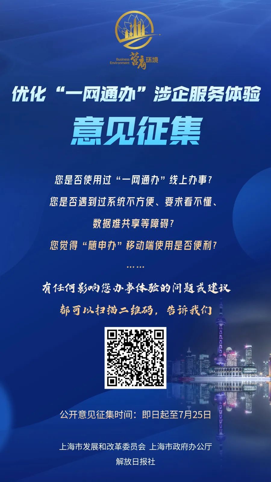 今年6月底,国务院常务会议对健全“高效办成一件事”重点事项常态化推进机制进行了部署。而此前的5月9日的国务院常务会议上也指出,要深化管理制度改革,大力推进“高效办成一件事”,解决企业反映突出的堵点卡点问题。在上海,“一网通办”(www.shanghai.gov.cn)平台、“随申办”移动端一直致力于为企业提供便利的办事服务,为进一步优化服务体验,今起至7月25日,上海市发改委、上海市政府办公厅联合解放日报社,面向企业和社会各界公开征集政务服务“一网通办”涉企事项办理流程和功能优化的问题和建议。