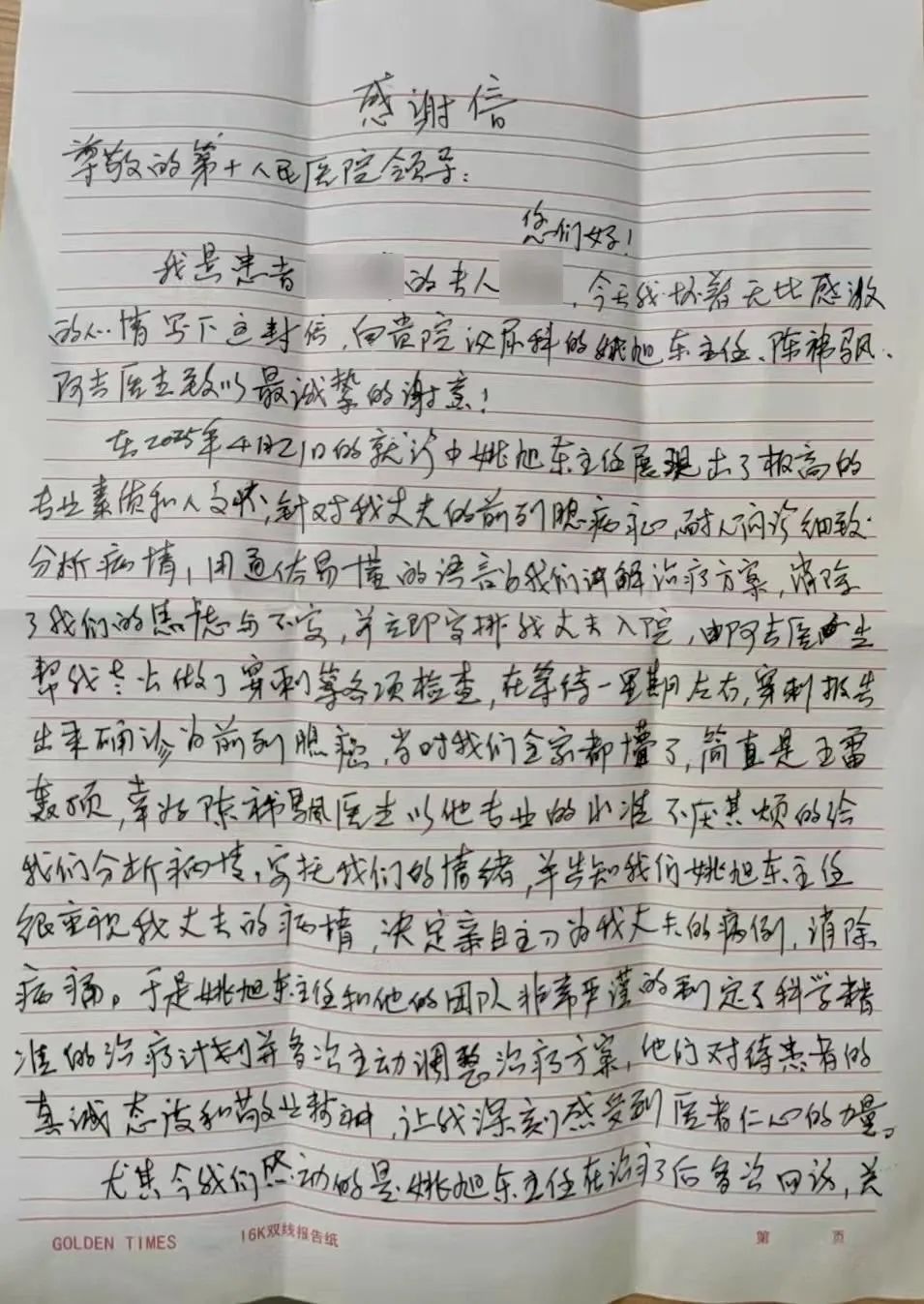 吉老伯和家人心中涌起无数问题,就在一家人六神无主之际,“十院医生以他们专业的水准,不厌其烦地给我们分析病情,安抚我们的情绪……”感谢信中,吉老伯和家属细细讲述当时的焦虑和获得支持后对医护团队的信任。