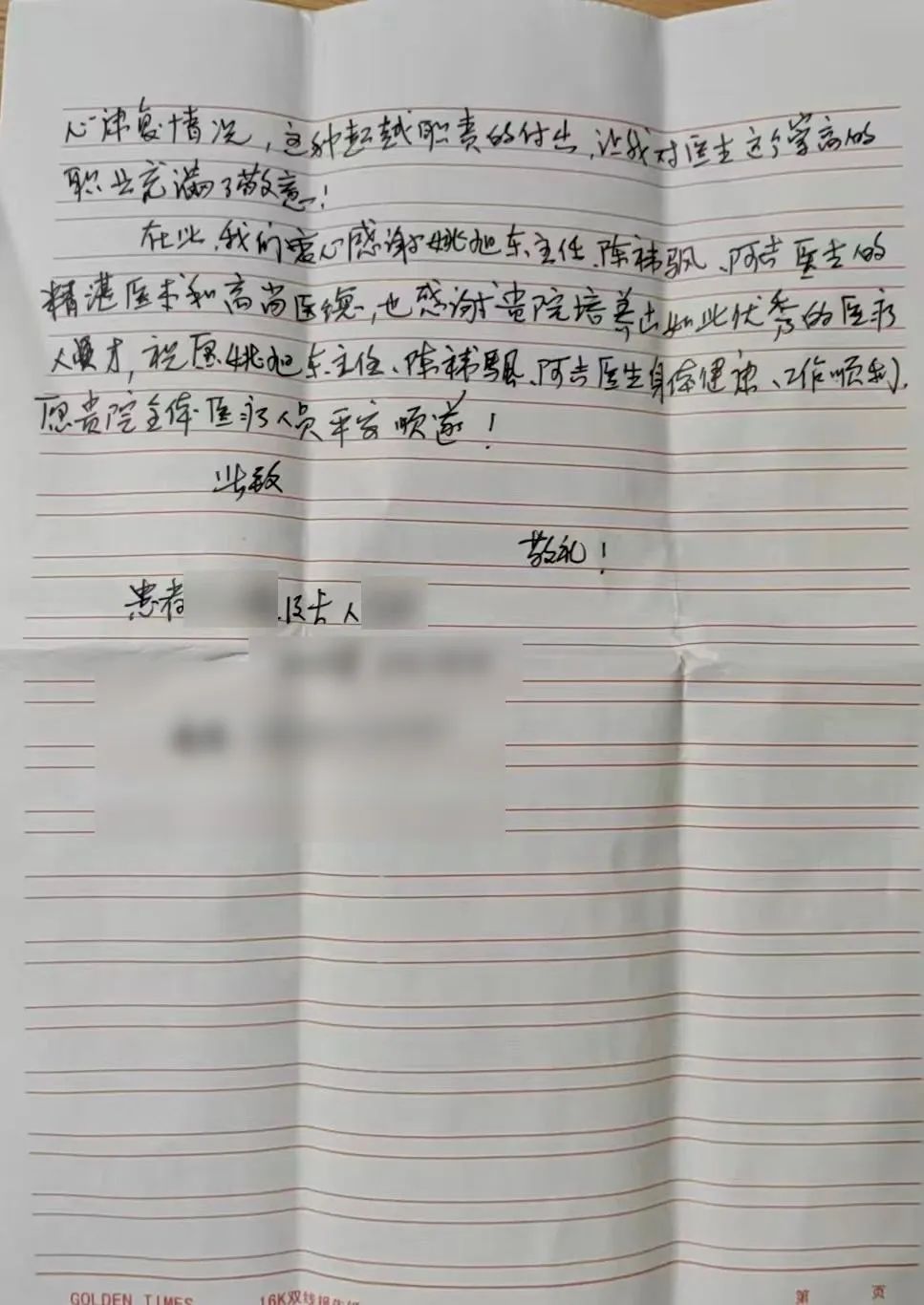 “医护团队无微不至的关心和付出,让我对医生这个崇高的职业充满了敬意。”吉老伯用文字再次表达了由衷的感谢。