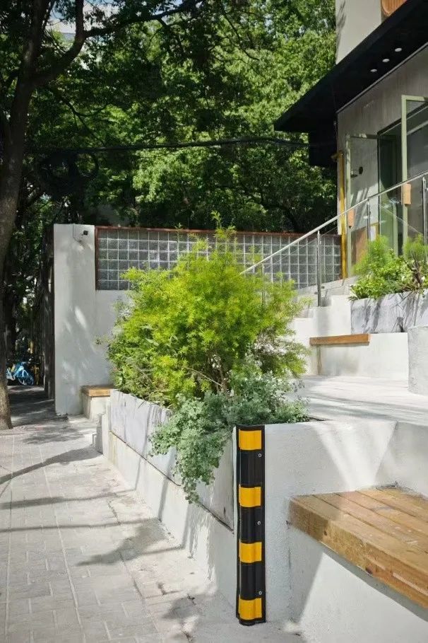 议一议,共商设计。南阳路154号建筑是街区中为数不多的自主更新项目。该建筑首层原为酒吧,沿街设有围墙,其夜间营业对周边居民休息造成较大影响。业主计划拆除围墙,改造建筑前区,并引入更符合周边居民需求的商业业态。然而,由于地下车库的存在,建筑首层与南阳路人行道存在2.1米高差,使得建筑前区改造面临多重挑战:需在有限空间内同时满足店铺进出、高差处理、景观美化及社区共享等功能需求。在此过程中,社区规划师充分发挥了统筹协调、技术指导和缝合各方诉求的重要作用。