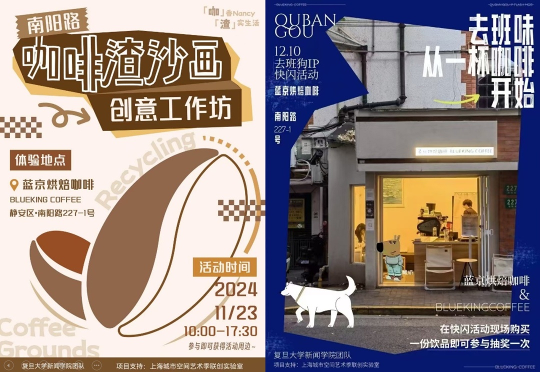 市规划院邀请复旦大学信息与传播研究中心,围绕南西社区的饮食文化与记忆故事,开展了十多场调研和活动。线上线下联动的话题持续发酵,既引发了人们对饮食文化如何塑造城市空间独特形象的深入探讨,也为公众提供了情感共鸣与生活体验的交流平台。蓝京烘焙咖啡店成为大学生们开展活动的实验地,通过“咖啡渣沙画创意工作坊”“去班味”文化IP许愿等活动,白领和居民们在享用咖啡的碎片时间里,不仅体验了创意绘画、学习了咖啡渣再利用方法、收获了减压祝福,更萌发了增进社区交流的美好愿望。