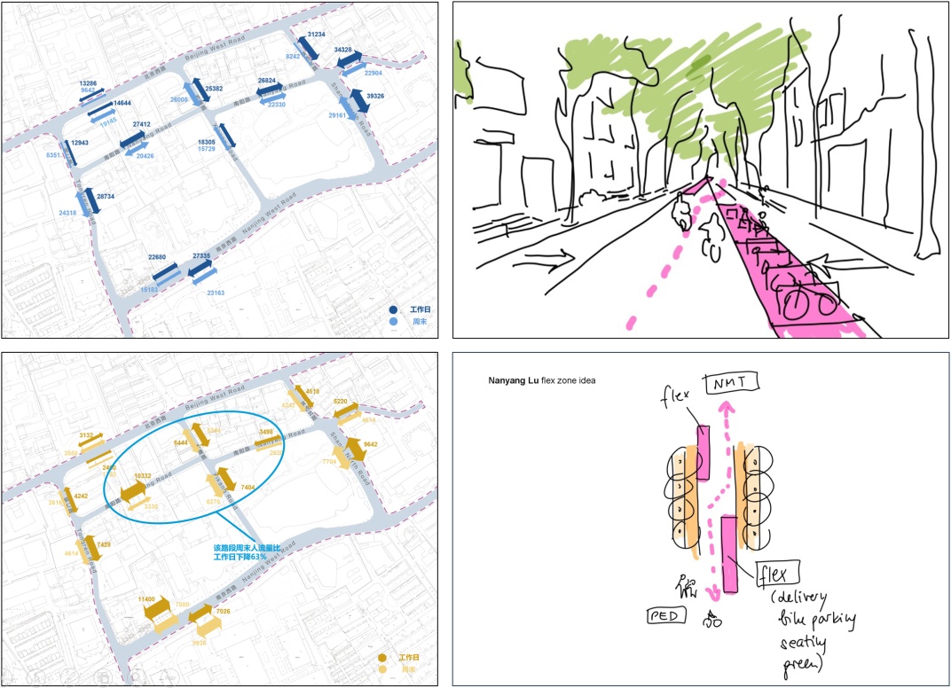 志愿者们手绘细致的环境要素地图,记录全天不同时段的多种交通方式流量变化,观察街巷的美食魔力。这些调研数据的对比分析,呈现出繁华商圈背后的日常百态,工作日喧嚣闹腾,休息日娴静松弛。同时,也能发现很多问题和潜力,比如,工作日的南阳路承载着巨大的人行和非机动车通行量,但有限的人行空间又因为无序的非机动车停车和活跃的商业外摆而被进一步占据。研究团队提出街道弹性空间实验,通过灵活布局停车、外摆、城市家具等模块,减缓通行车速,保障慢行友好与安全。