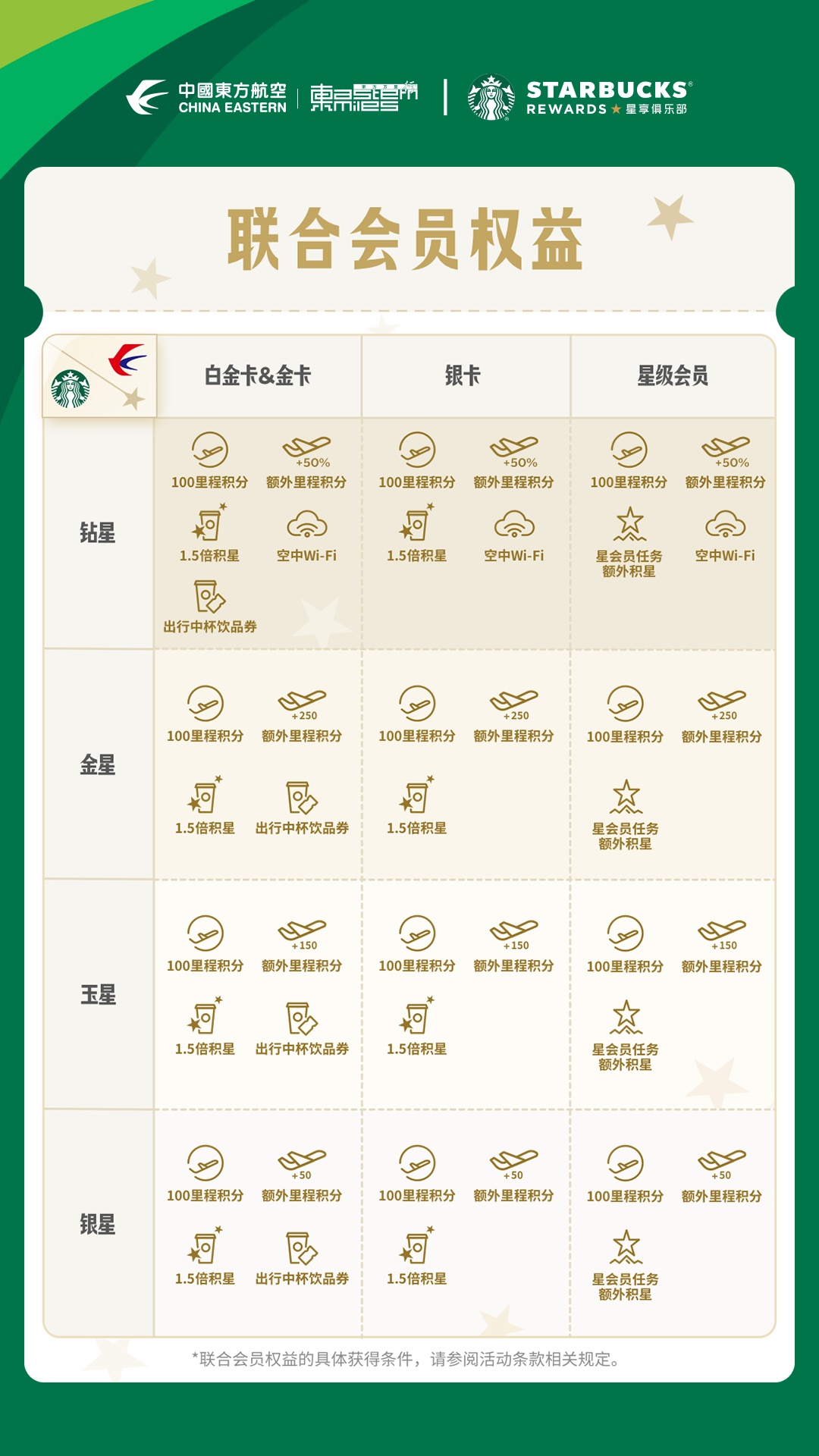 消费加速礼遇:在星巴克官方渠道消费,东方万里行白金卡、金卡、银卡会员可享星巴克1.5倍好礼星星加速礼遇,L1-L6会员7天内消费满 100 元可额外获赠一次3颗好礼星星;在东航自有渠道购买东、上航航班时,星巴克钻星会员可享1.5倍东航里程积分,其他等级会员消费满额可加赠额外积分。