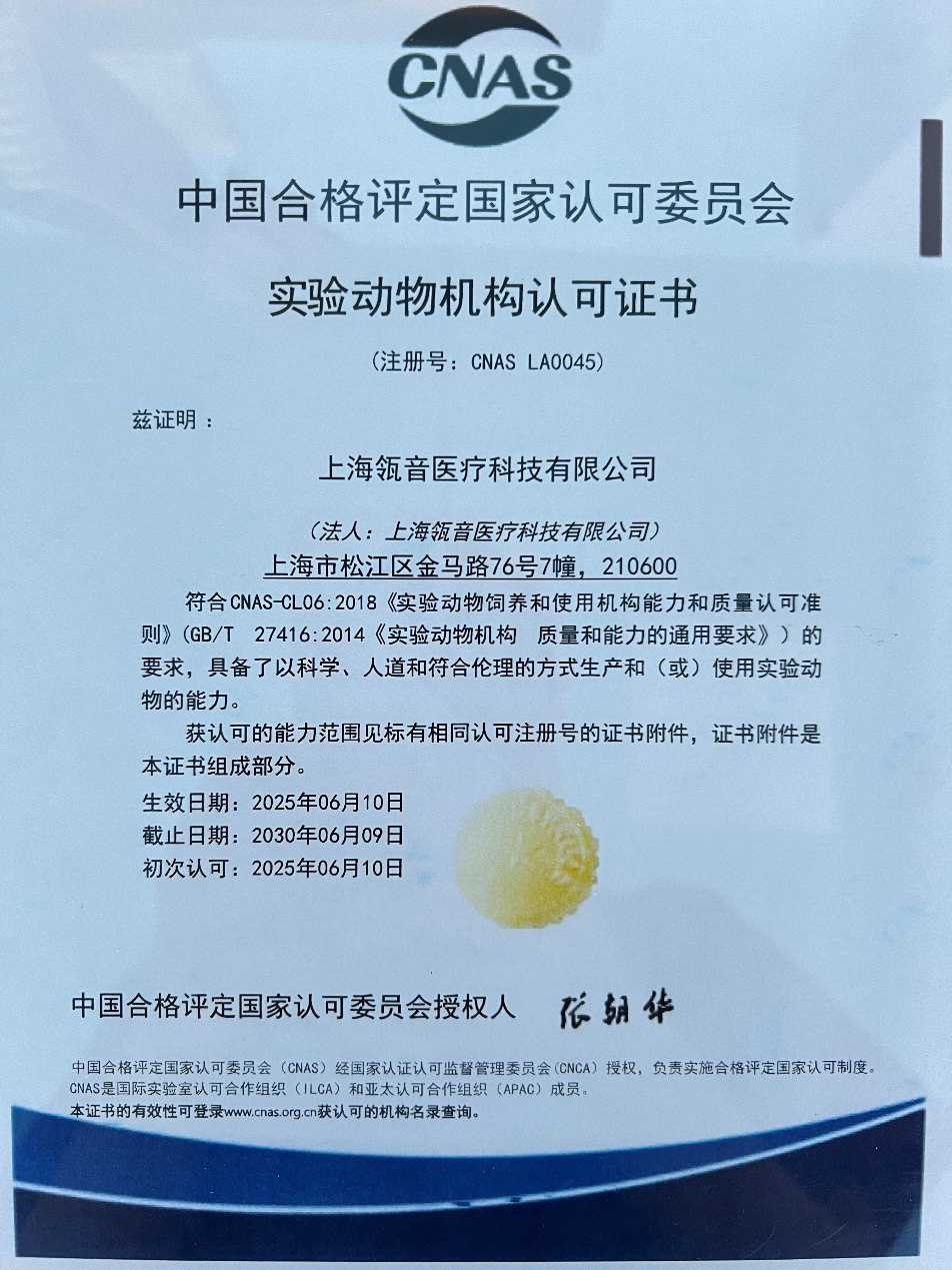 位于九亭镇的上海瓴音医疗科技有限公司(以下简称:瓴音医疗)日前获得中国合格评定国家认可委员会(CNAS)实验动物机构认可证书(注册号:CNAS LA0045),标志着其实验动物研究能力达到国际通用标准。