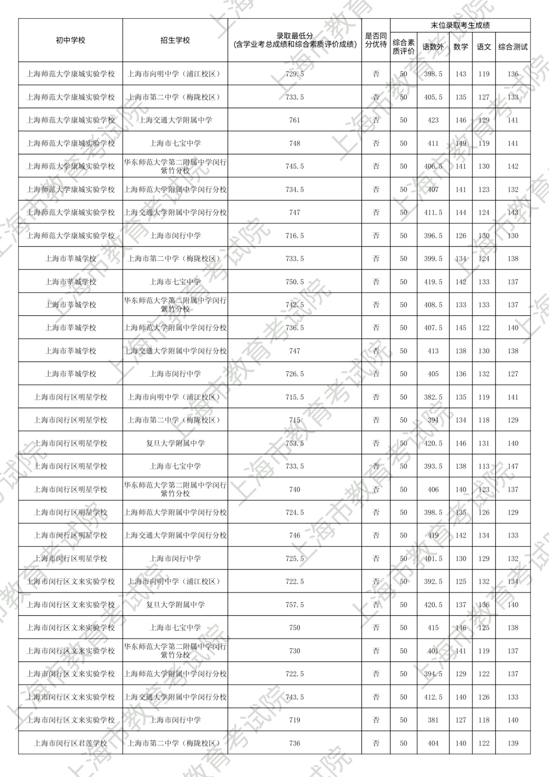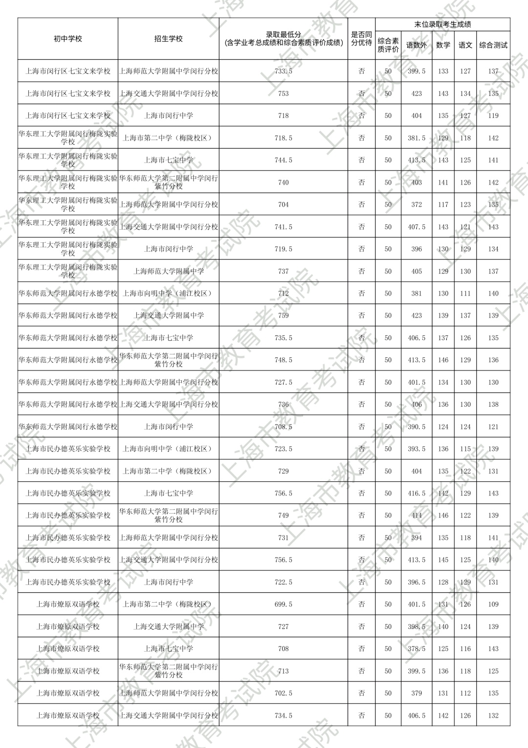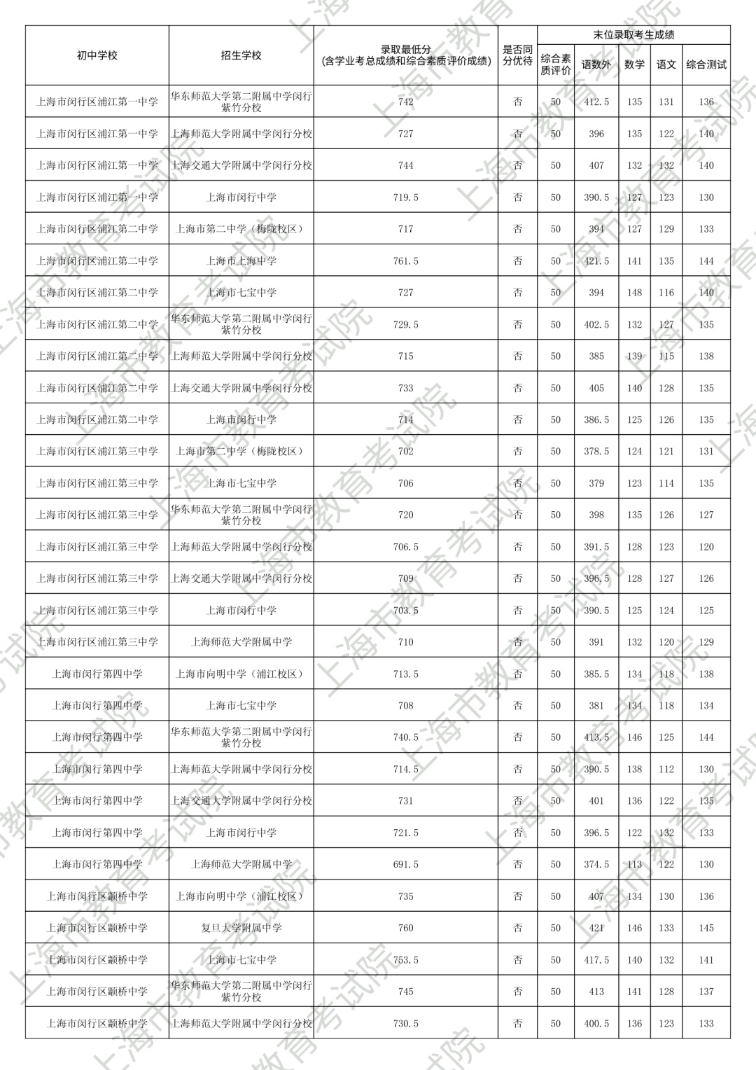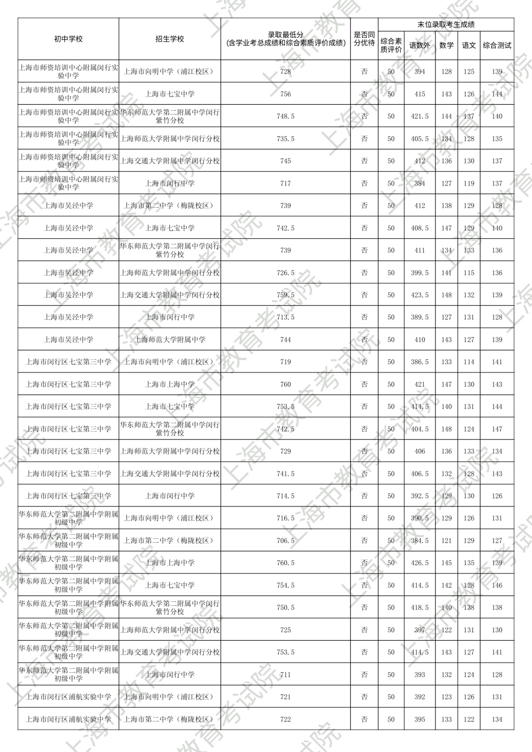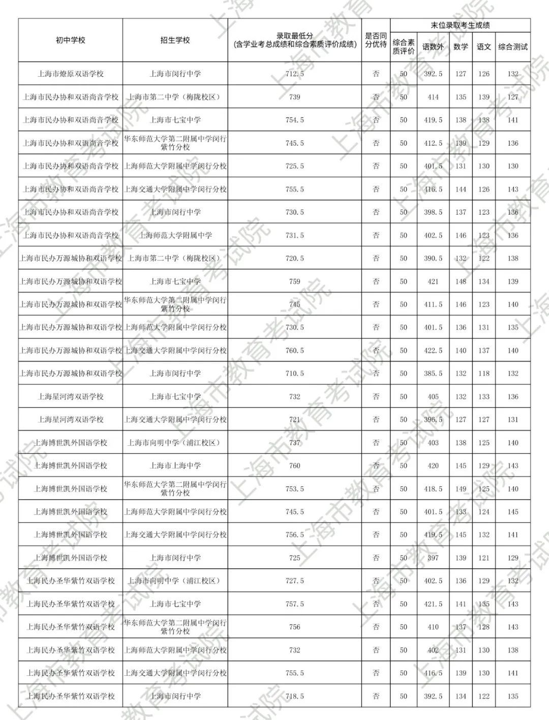 1.录取最低分中均含综合素质评价成绩(满分为50分)。2.“名额分配到区”和“名额分配到校”投档末位同分时,按下列规则排序录取:第3位序,比较语文、数学、外语三科合计成绩,高者优先。第6位序,比较综合测试(含物理、化学、跨学科案例分析、物理和化学实验操作)成绩,高者优先。