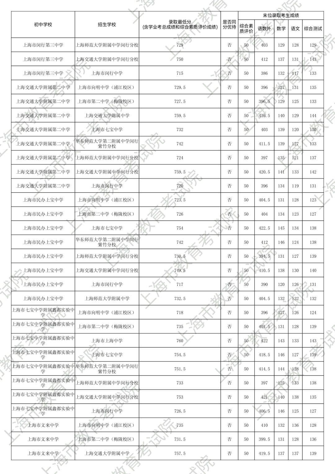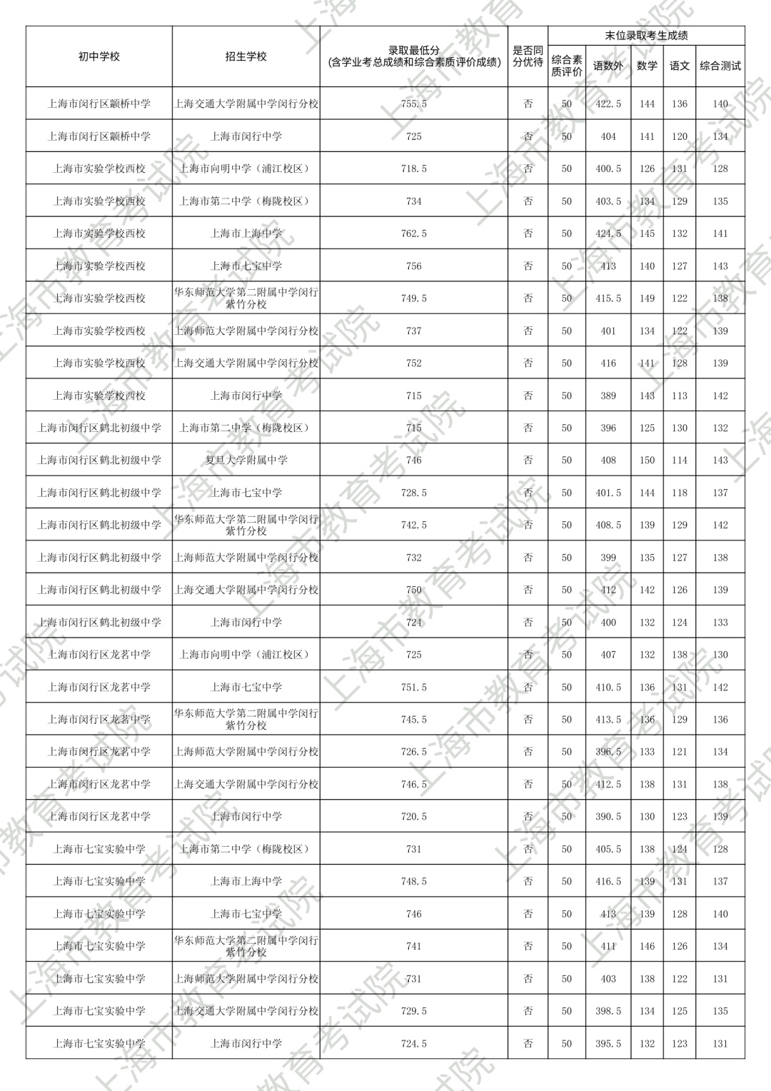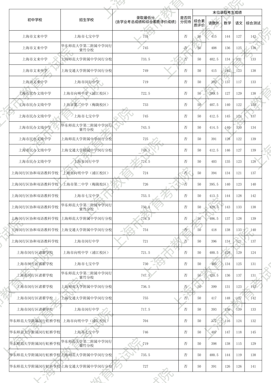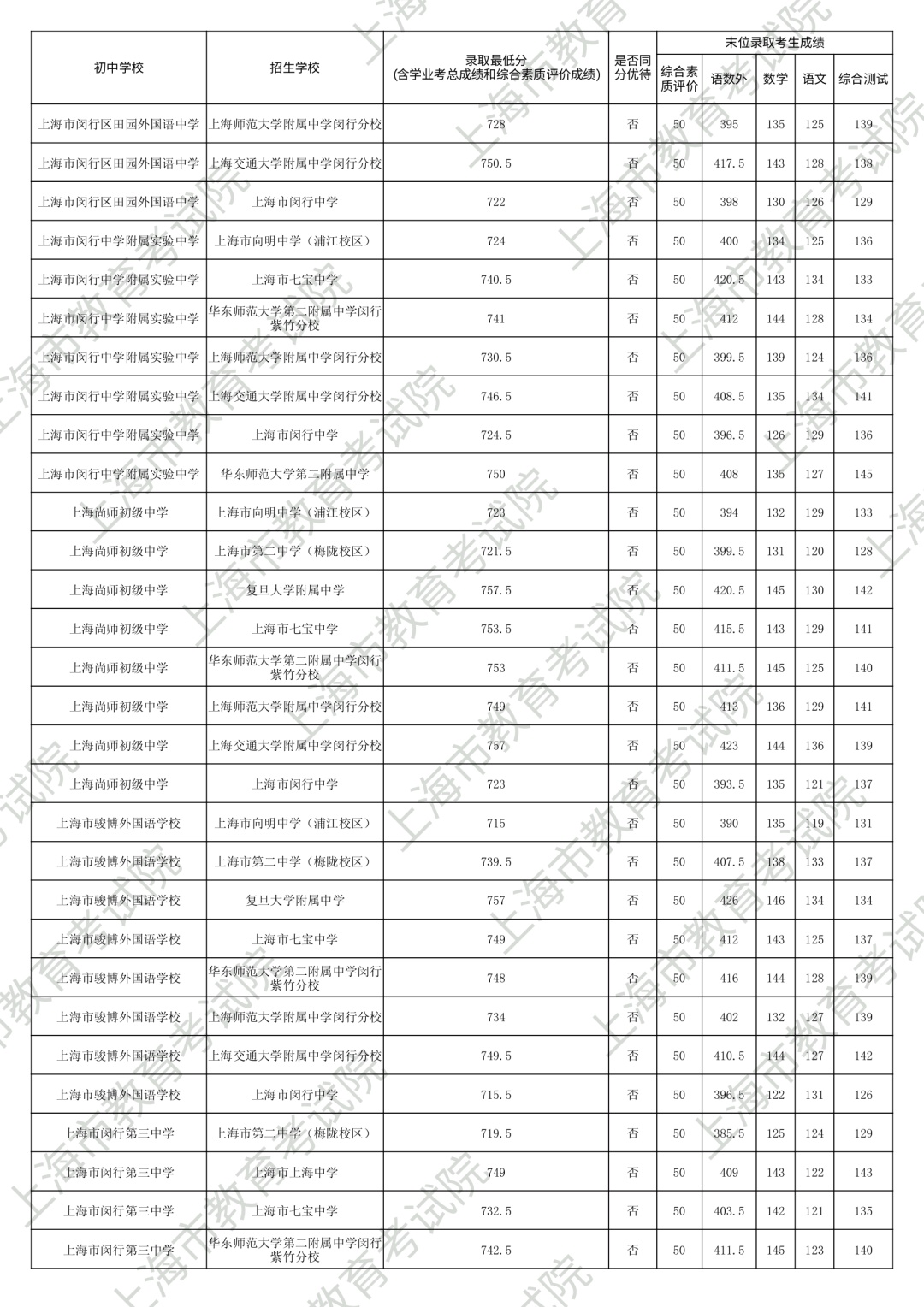 1.录取最低分中均含综合素质评价成绩(满分为50分)。2.“名额分配到区”和“名额分配到校”投档末位同分时,按下列规则排序录取:第3位序,比较语文、数学、外语三科合计成绩,高者优先。第6位序,比较综合测试(含物理、化学、跨学科案例分析、物理和化学实验操作)成绩,高者优先。