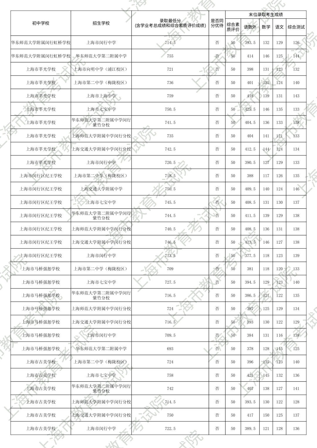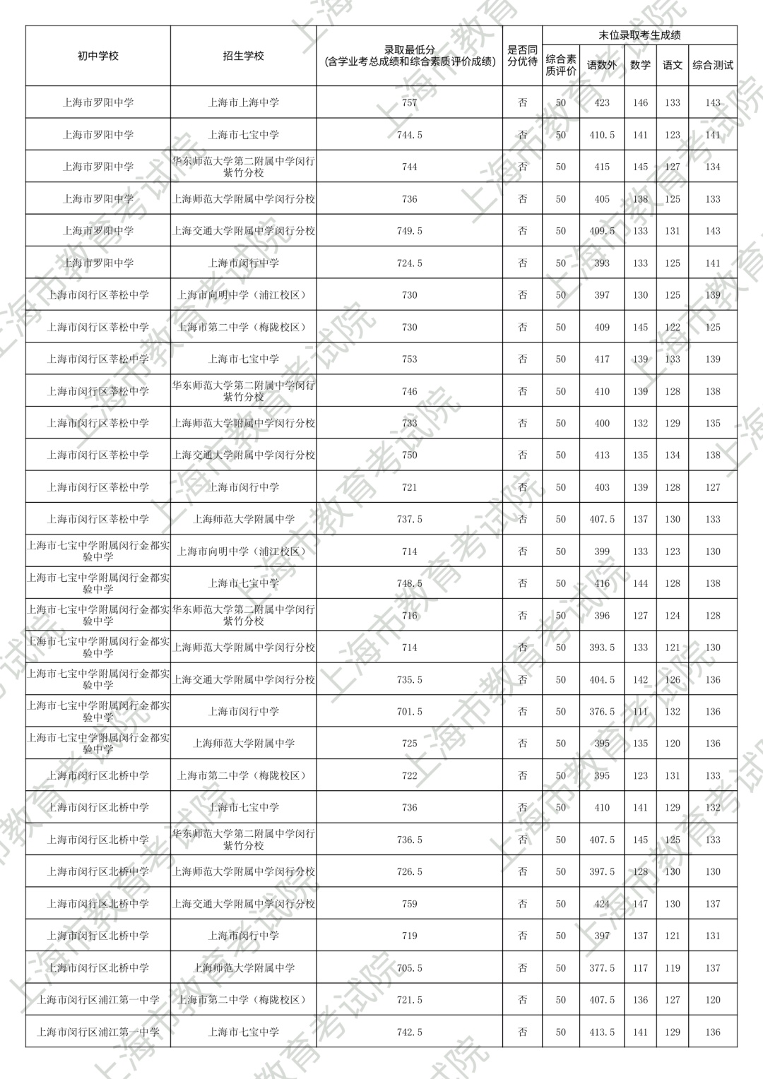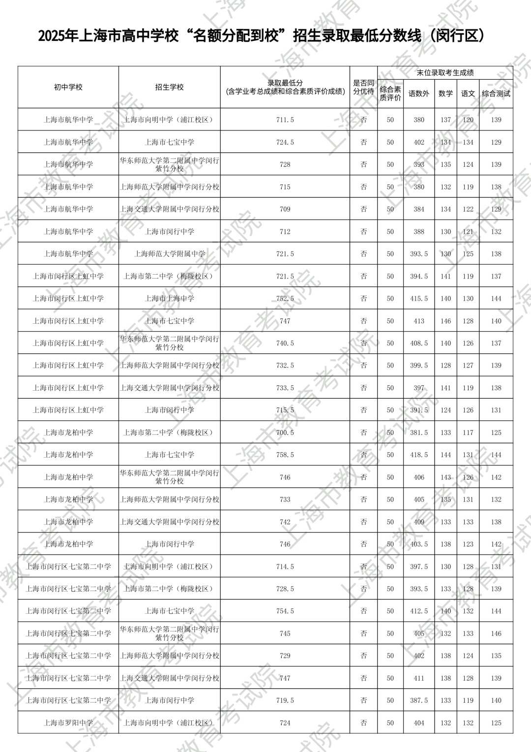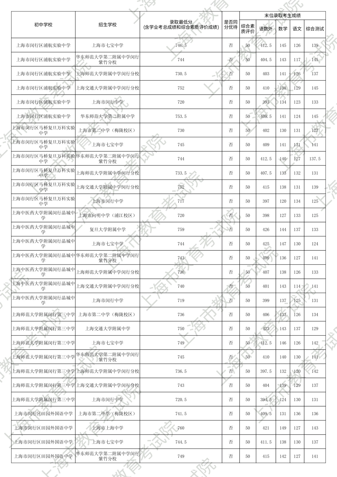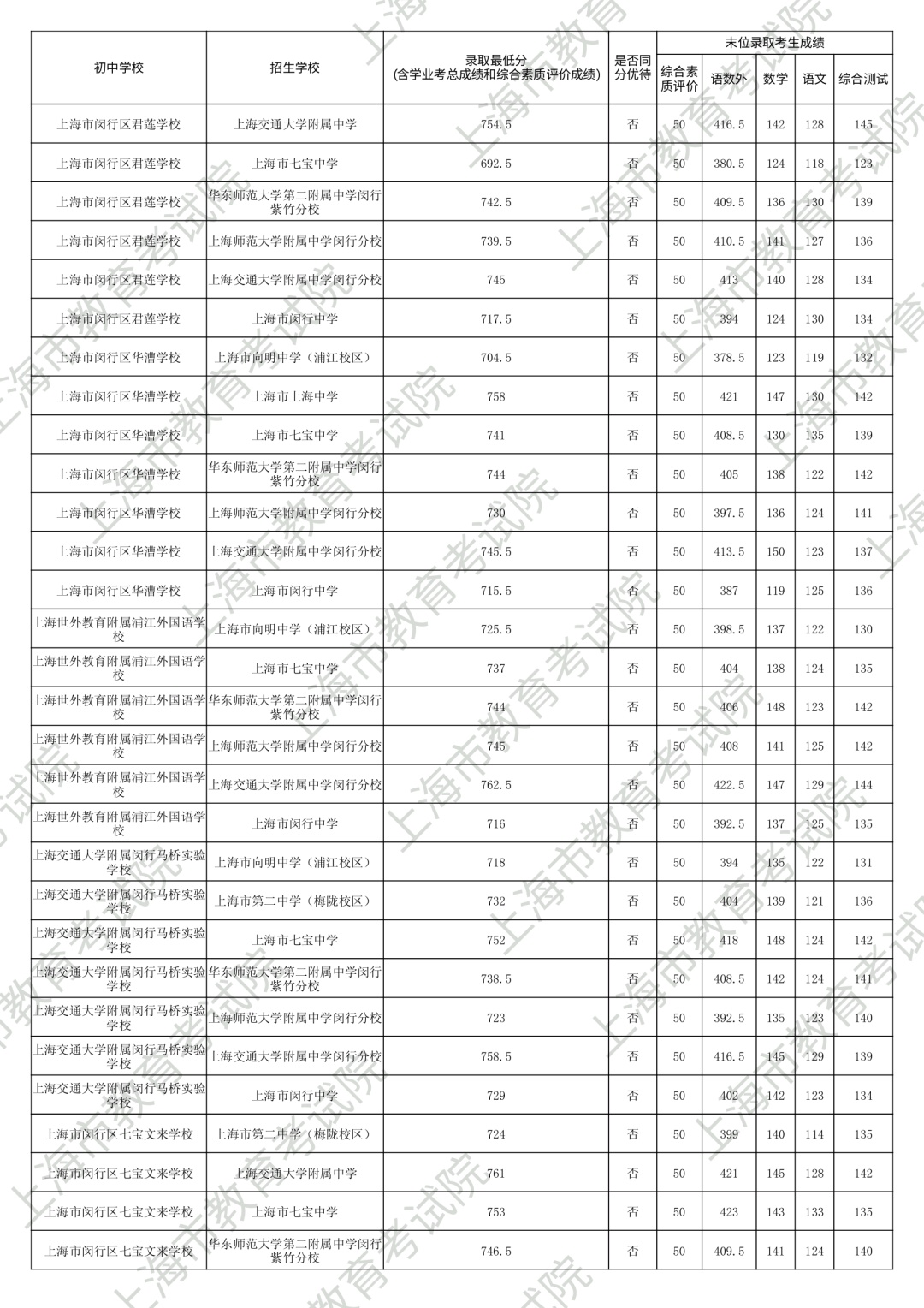 1.录取最低分中均含综合素质评价成绩(满分为50分)。2.“名额分配到区”和“名额分配到校”投档末位同分时,按下列规则排序录取:第3位序,比较语文、数学、外语三科合计成绩,高者优先。第6位序,比较综合测试(含物理、化学、跨学科案例分析、物理和化学实验操作)成绩,高者优先。
