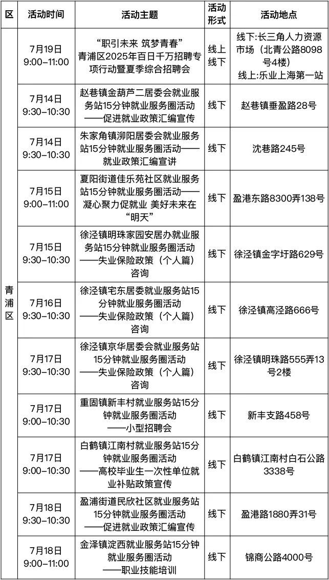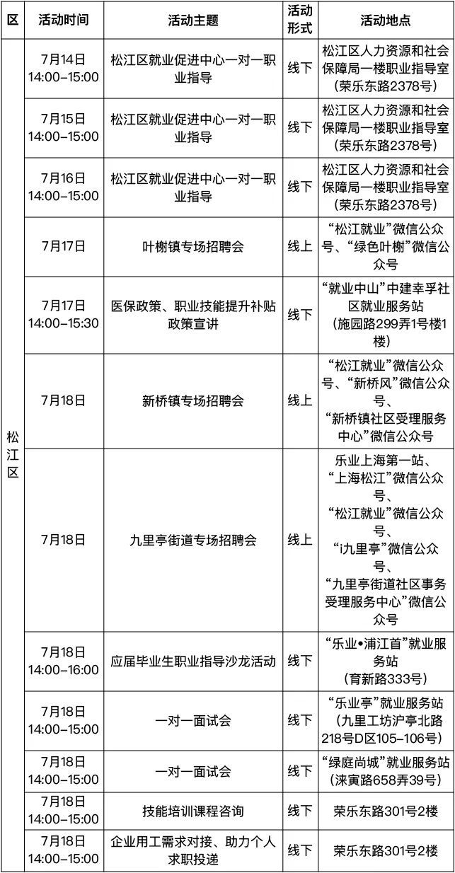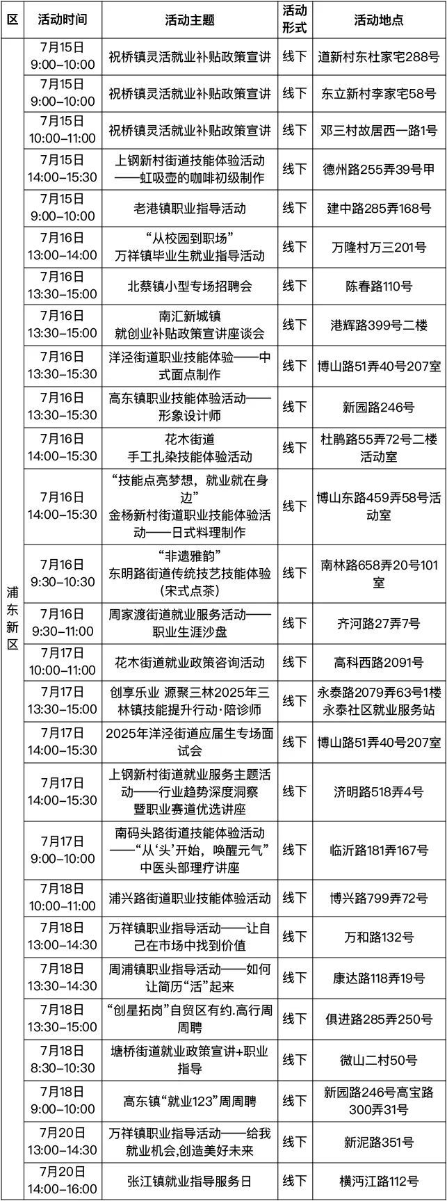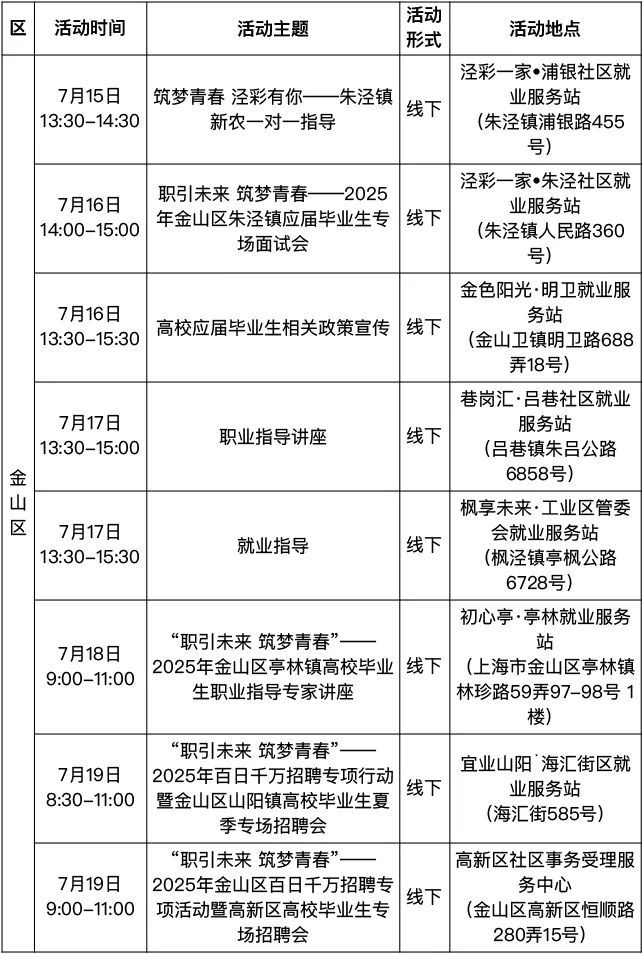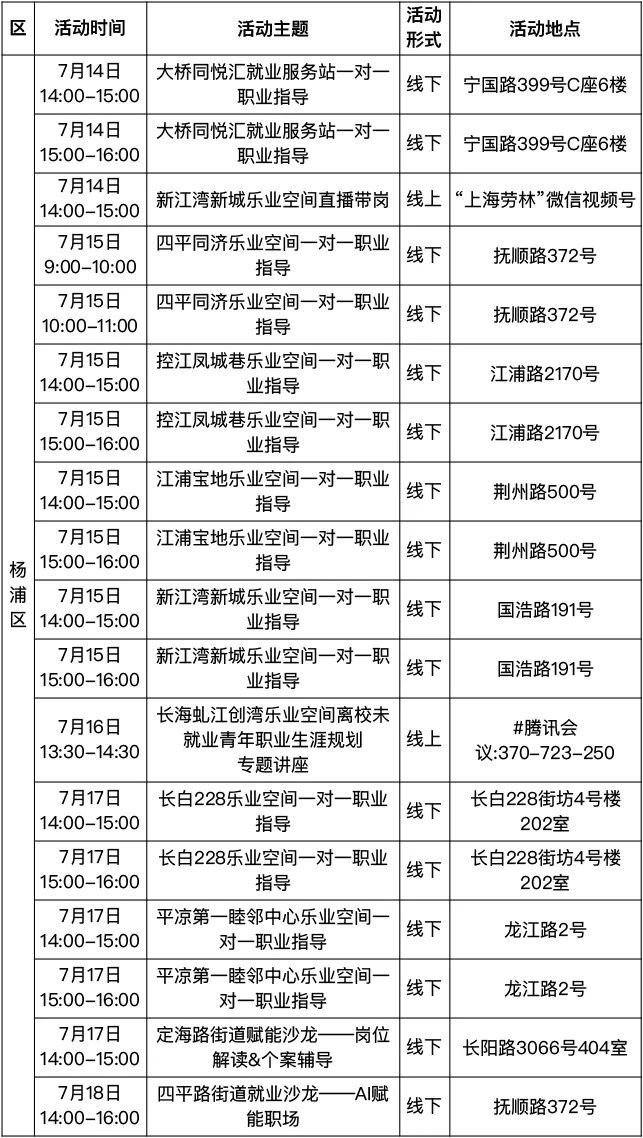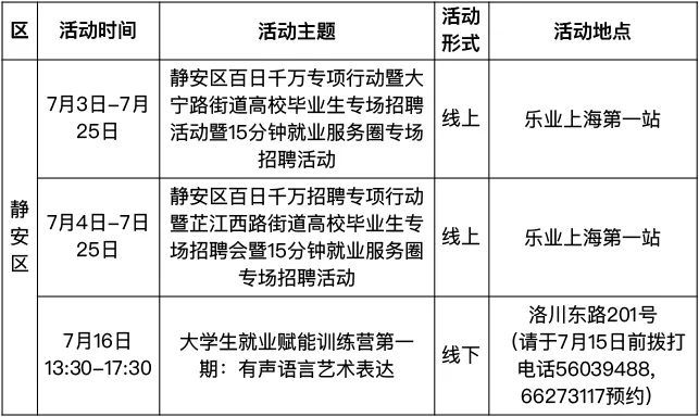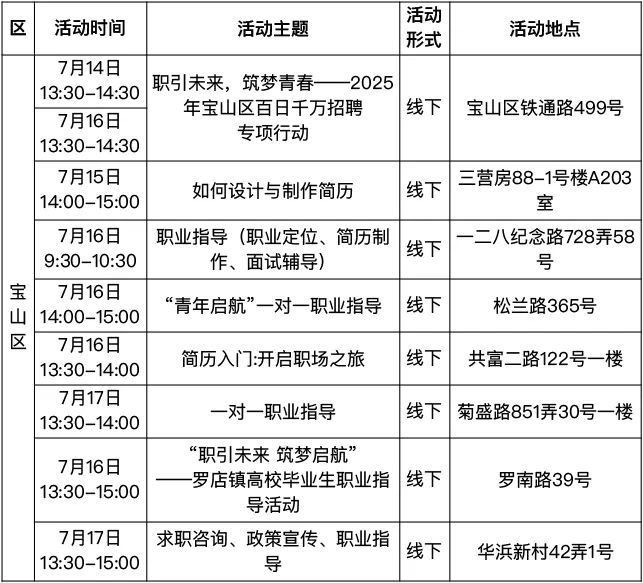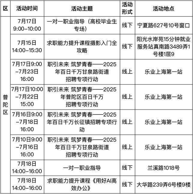 “乐业上海优+”行动正在进行中!为了更好地帮助大家拓宽就业机会,提供更优质的公共就业服务举措,全市200余场就业服务活动,喊你来参加,其中普陀共有8场。来看↓ 以下信息仅供参考 具体以现场实际举办为准 “乐业上海优+”活动排片表 普陀区 (点击查看大图) 浦东新区 (点击查看大图) 黄浦区 (点击查看大图) 静安区 (点击查看大图) 徐汇区 (点击查看大图) 长宁区 (点击查看大图) 虹口区 (点击查看大图) 杨浦区 (点击查看大图) 宝山区 (点击查看大图) 闵行区 (点击查看大图) 嘉定区 (点击查看大图) 金山区 (点击查看大图) 松江区 (点击查看大图) 青浦区 (点击查看大图) 奉贤区 (点击查看大图) 崇明区 (点击查看大图) 点击下方了解更多 【数智普陀 向新而行】曹杨“掌中宝”照亮15分钟生活圈 【普陀民企·苏河扬帆】聚焦智能软件赛道,以AI赋能服务企业发展 上海拿什么吸引优质内容创作?好故事与一座城,是“双向奔赴” 【活动】和爸妈一起编出二十四节气的小美好 普陀 你好 | 实干当先,奋跃不止
