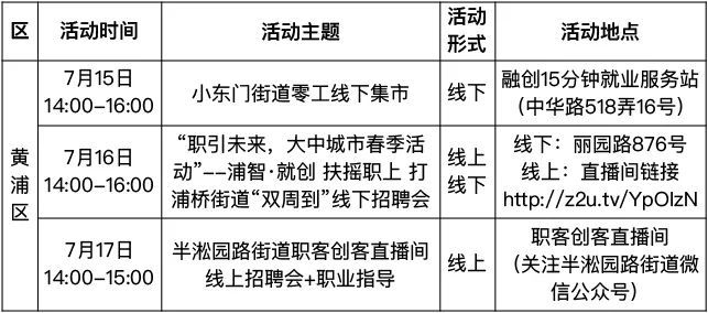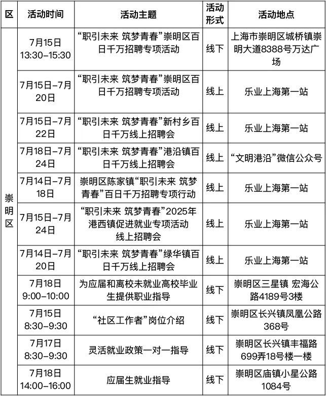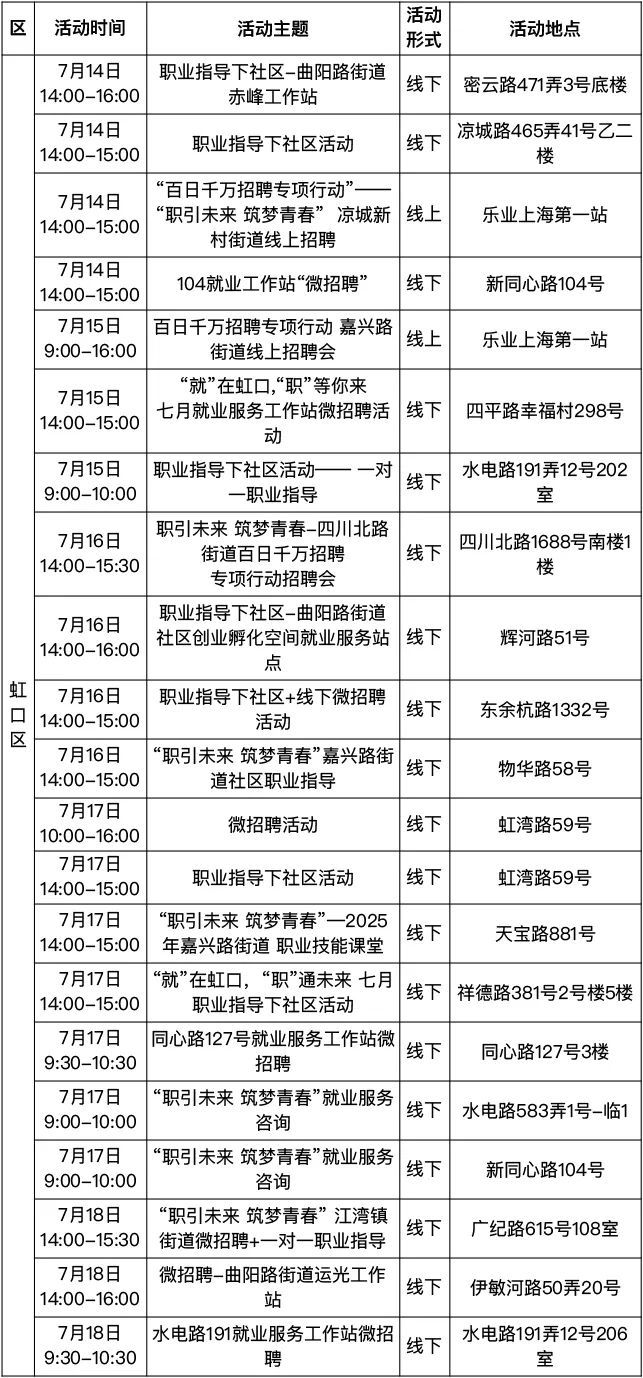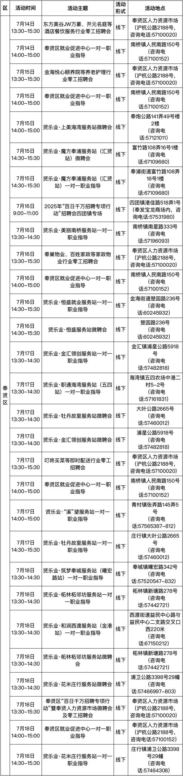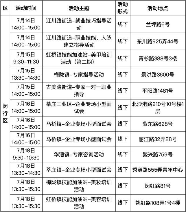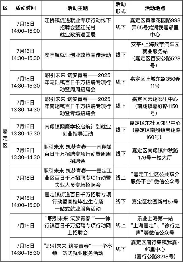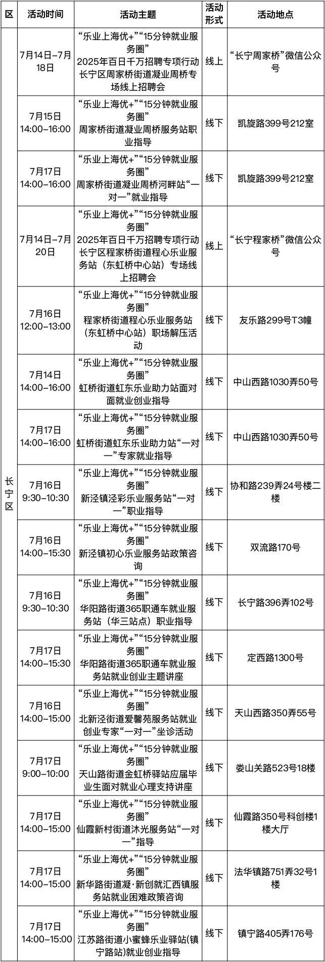 “乐业上海优+”行动正在进行中!为了更好地帮助大家拓宽就业机会,提供更优质的公共就业服务举措,全市200余场就业服务活动,喊你来参加,其中普陀共有8场。来看↓ 以下信息仅供参考 具体以现场实际举办为准 “乐业上海优+”活动排片表 普陀区 (点击查看大图) 浦东新区 (点击查看大图) 黄浦区 (点击查看大图) 静安区 (点击查看大图) 徐汇区 (点击查看大图) 长宁区 (点击查看大图) 虹口区 (点击查看大图) 杨浦区 (点击查看大图) 宝山区 (点击查看大图) 闵行区 (点击查看大图) 嘉定区 (点击查看大图) 金山区 (点击查看大图) 松江区 (点击查看大图) 青浦区 (点击查看大图) 奉贤区 (点击查看大图) 崇明区 (点击查看大图) 点击下方了解更多 【数智普陀 向新而行】曹杨“掌中宝”照亮15分钟生活圈 【普陀民企·苏河扬帆】聚焦智能软件赛道,以AI赋能服务企业发展 上海拿什么吸引优质内容创作?好故事与一座城,是“双向奔赴” 【活动】和爸妈一起编出二十四节气的小美好 普陀 你好 | 实干当先,奋跃不止