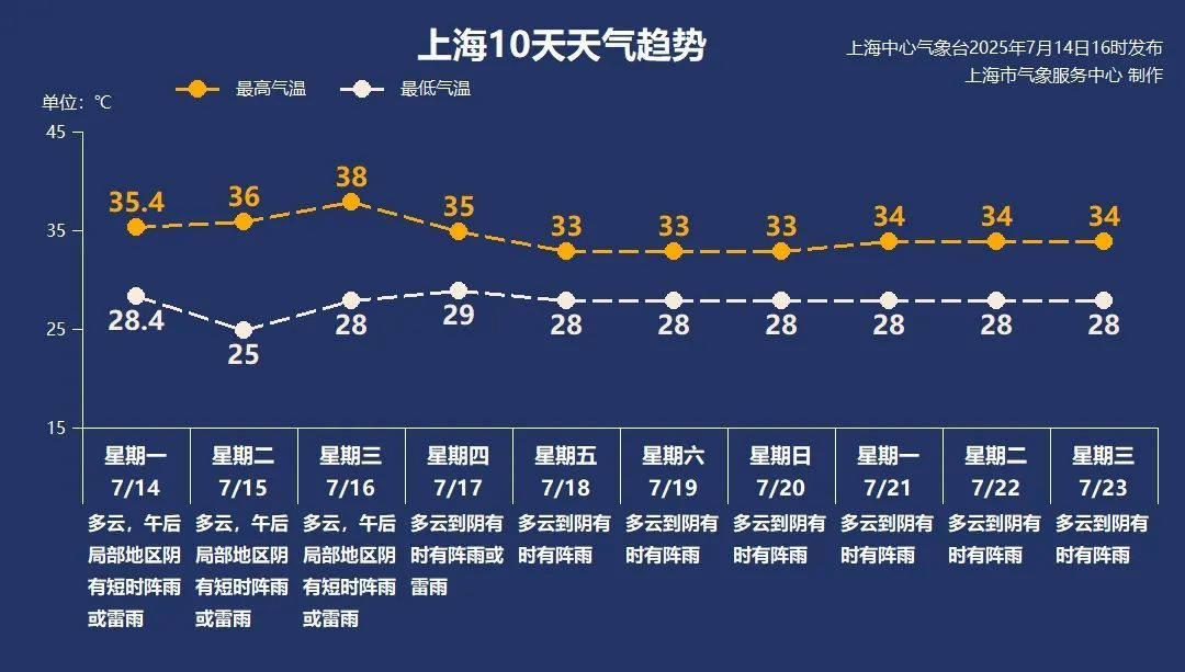 申城本周前半周主打“高温+下开水”。预计本周极端最高气温出现在周三,可达38℃,不仅白天气温高,最低气温也不低,多在28~29℃,可谓是从早热到晚,防暑降温工作不可松懈。周五起受偏东气流影响,申城多阵雨天气,最高气温下降至33~34℃。