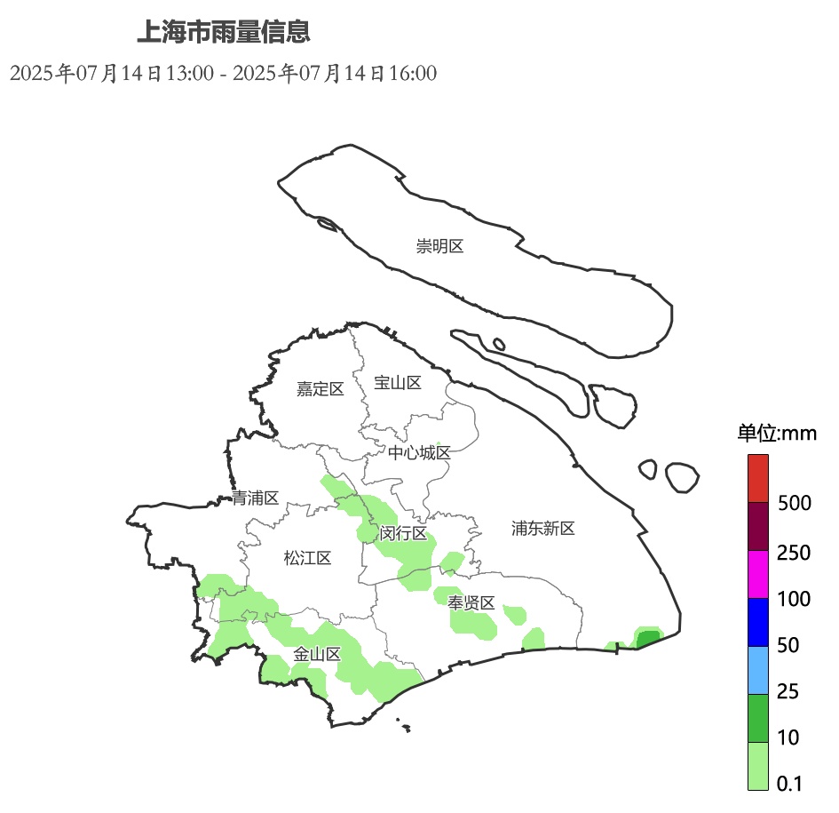 午后随着对流云团的发展,上海中心气象台13时15分发布雷电预警信号,本市西南部、中部和东南部等地出现了阵雨或雷雨天气,13时~16时雨量统计显示,浦东南汇新城镇16.5毫米为最大。