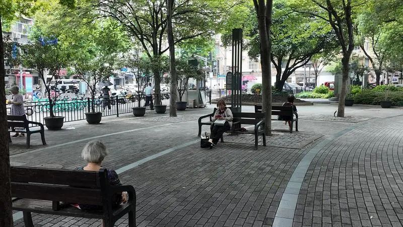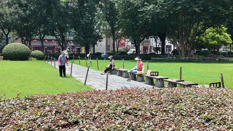 在市中心的街心花园,周边居民们趁着太阳还不非常炽热以及还没有下雨的时段抓紧出门散步、遛娃、健身,炎炎夏日,出门便是做好大汗淋漓的准备,户外待上几分钟就汗如雨下,稍微活动一下,便赶紧回家孵空调。