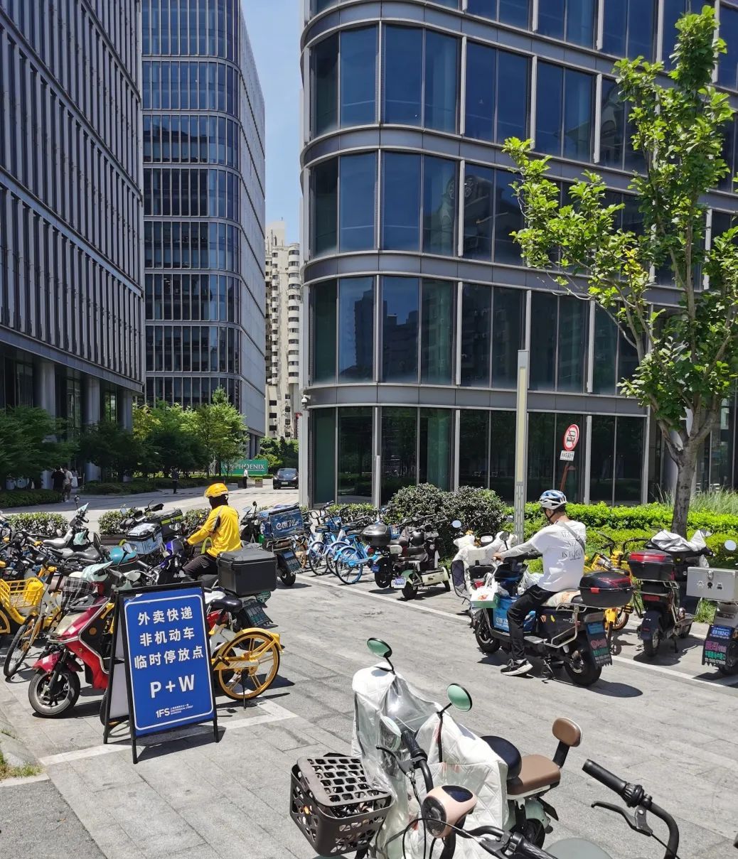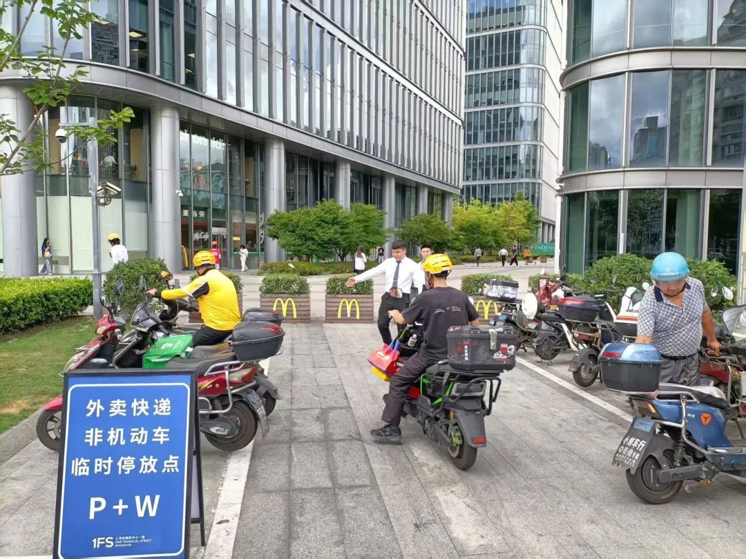作为商务楼宇密集区,金融街1FS商圈曾有外卖电动车乱停放造成的“老大难”问题。为了节省时间,有些外卖小哥把车停放在办公楼外的人行通道上,不仅给企业员工和周边居民带来诸多不便,还破坏了片区的整体形象。