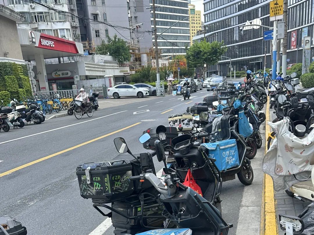 正午时分,大统路中华新路口的蓝色停车区里,外卖员小吴利落地锁好电瓶车,拎起保温箱快步走向百米外的写字楼。