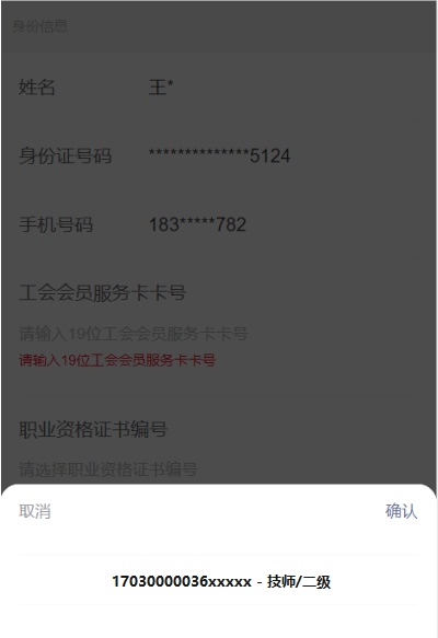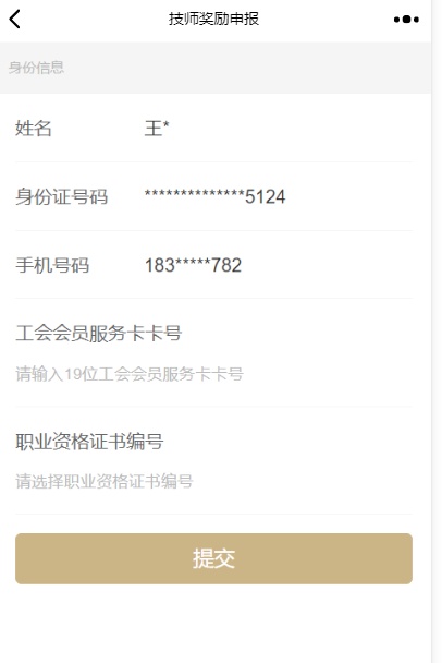 ②绑定申工社微信的职工无需输入身份信息,只需输入工会会员卡卡号,并选择需申请的证书,点击提交即完成申报。
