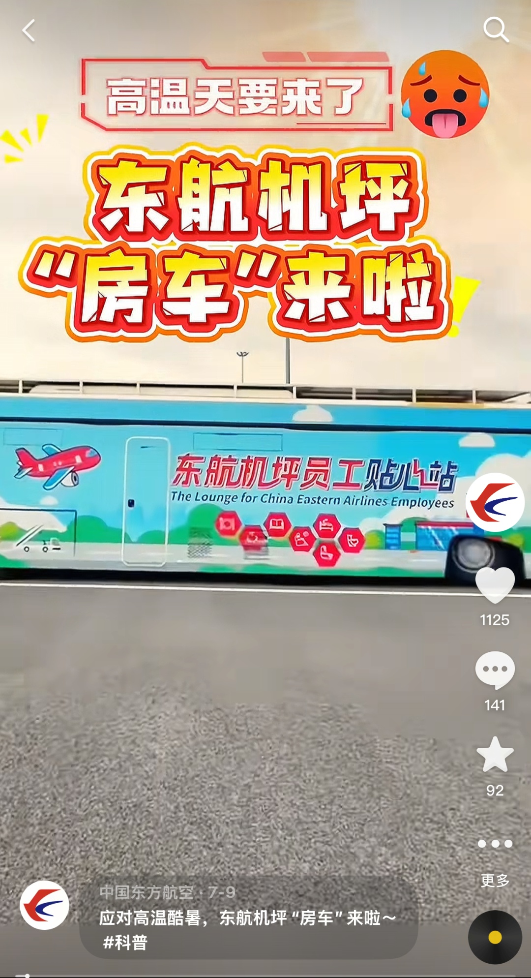 抖音、快手共发布10期内容,总播放量42万。其中“应对高温酷暑,东航机坪‘房车’来啦~ # 科普”收获了大量关注、互动与点赞。