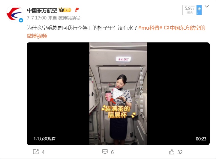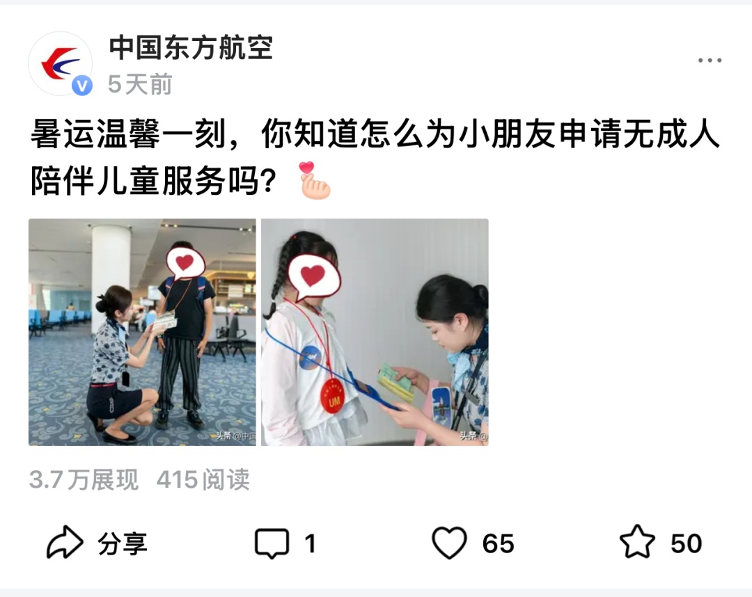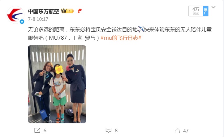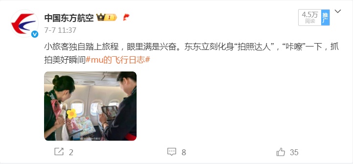 微博共发布22条内容,总流量67.1万。其中,“为什么空乘总是问我行李架上的杯子里有没有水?”、“小旅客独自踏上旅程,眼里满是兴奋。东东立刻化身'拍照达人','咔嚓'一下,抓拍美好瞬间”、"无论多远的距离,东东必将宝贝安全送达目的地,快来体验东东的无人陪伴儿童服务吧(MU787,上海-罗马)"获得了更多的曝光量。