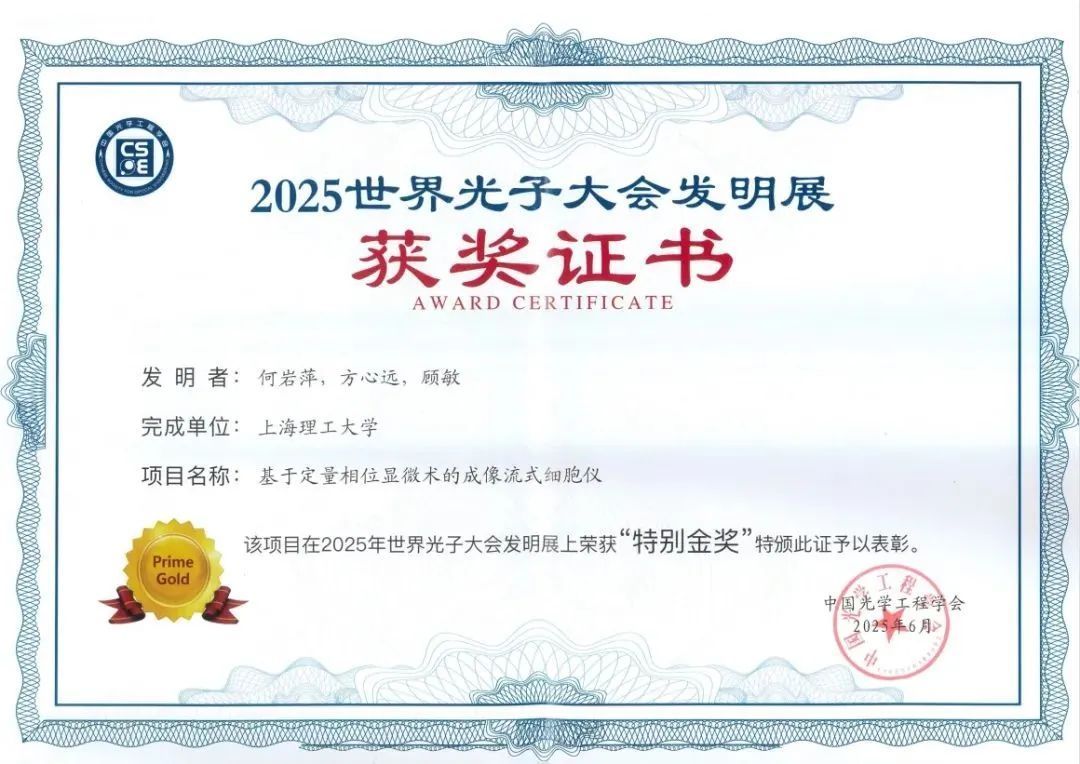 近日,“2025年世界光子大会发明展(第六届)”在北京国家会议中心举行。上海理工大学智能科技学院顾敏院士、方心远研究员团队研发的“基于定量相位显微术的成像流式细胞仪”在大会上荣获特别金奖。