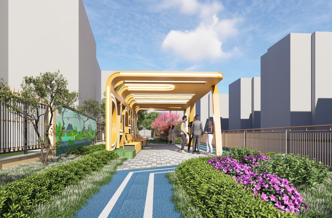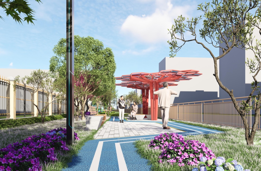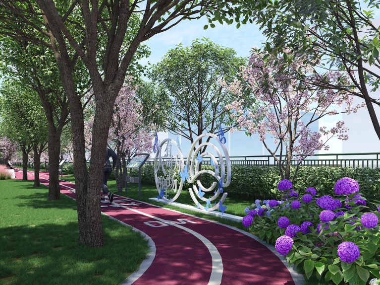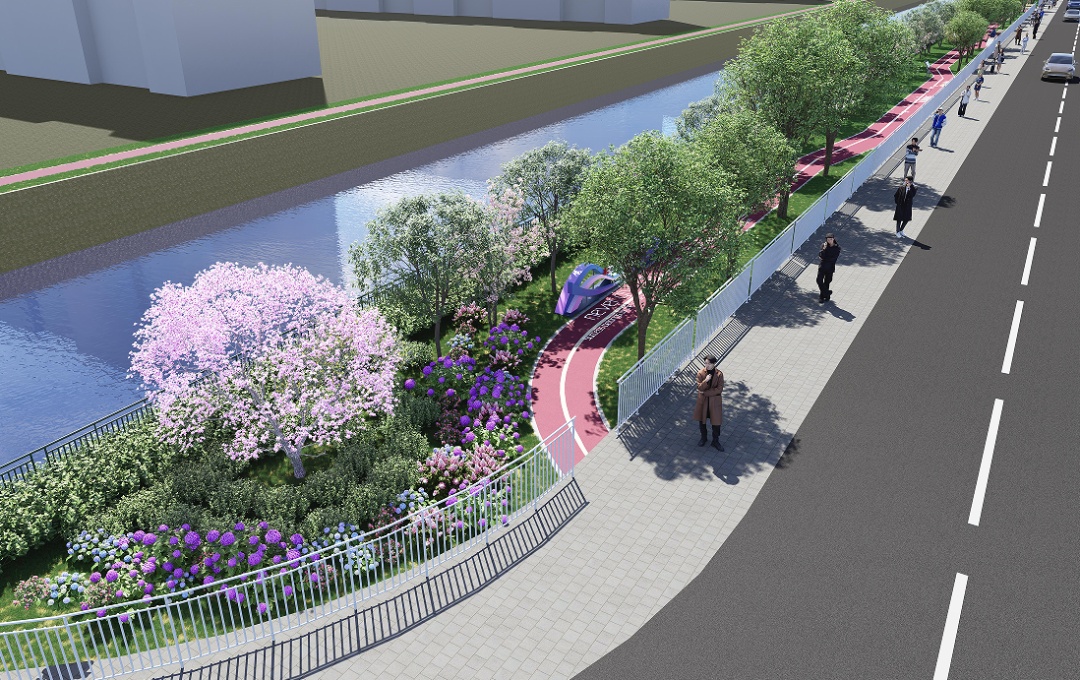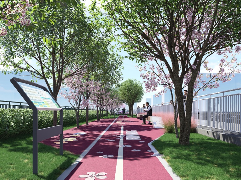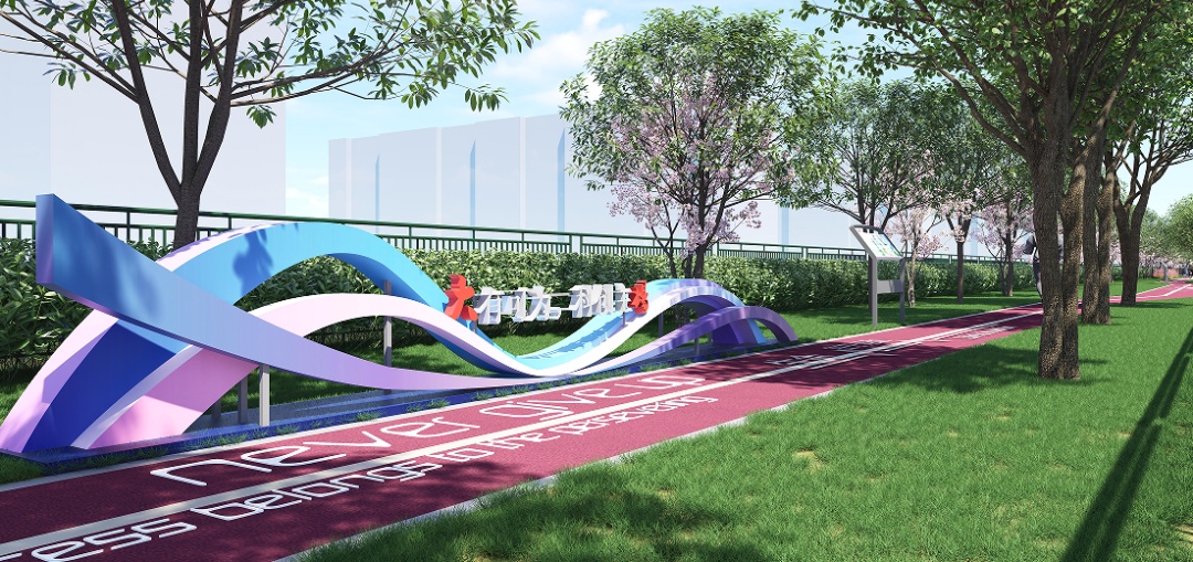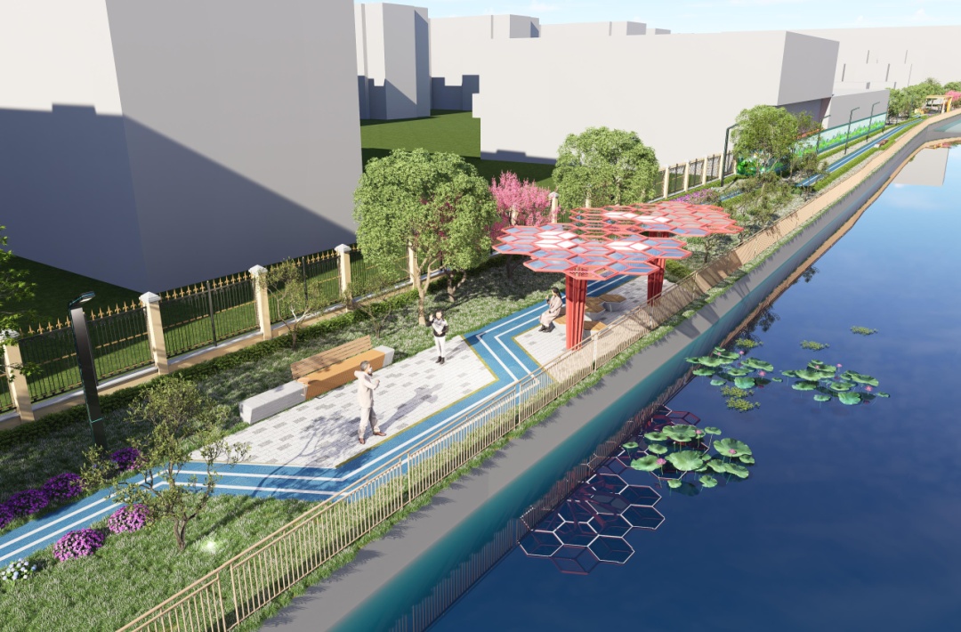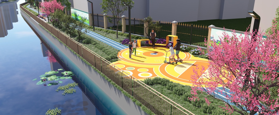 设计方案充分考虑市民群众的需求,在有限空间内,结合翻新绿植、景观小品和主题墙绘等方式,打造宜通行、宜驻留、宜社交的滨水线性开放带,将活力多彩的沿河公共空间开放给居民,进一步推动生态大场建设。