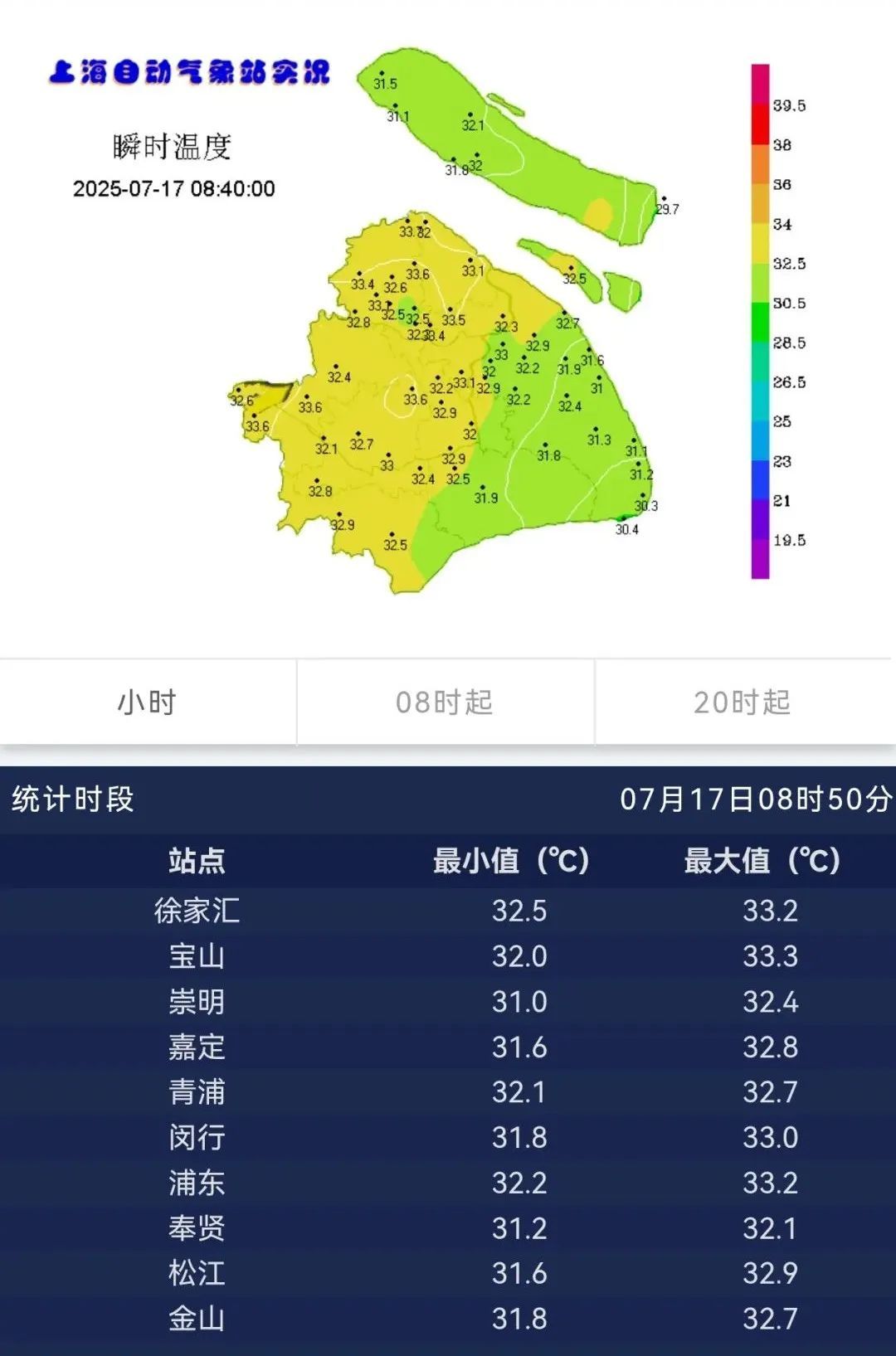 上海中心气象台2025年7月17日8时45分发布高温黄色预警信号:预计今天本市大部地区的最高气温将超过35℃,请注意用火用电安全,做好防暑防晒工作。当前气温综合自:上海发布、市气象服务中心制图:张伊婷编辑:宁平英转载请注明来自上海徐汇官方账号