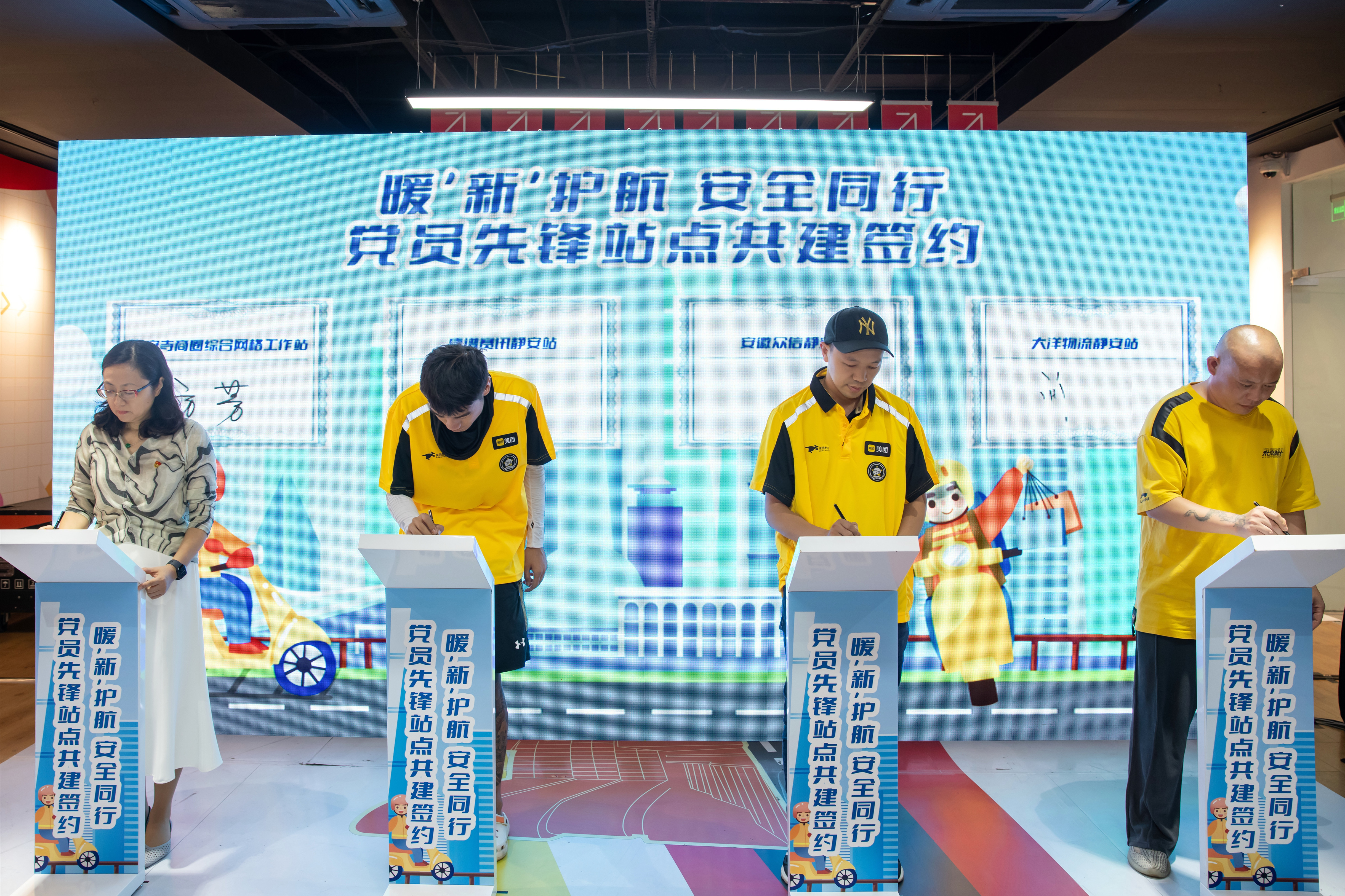 “我们不仅是美食与物资的传递者,更是商圈温度的守护者。我们倡议:党员带头,守护安全;严守规则,身体力行;文明礼让,传递温度。”活动现场,参加活动的骑手们纷纷在安全骑行倡议签名墙上签名承诺,共创文明。静安寺商圈综合网格工作站站长与美团快递静安工作站站长签约共建党员先锋站点。来自京东站点的党员骑手志愿者曹帅宾也向在场的骑手发出安全同行倡议。随着“同心e路安”“同心丰行者”“同心致美行”“同心京速达”四支安全骑行志愿守护队分别被授牌,党员骑手志愿者服务队正式成立。