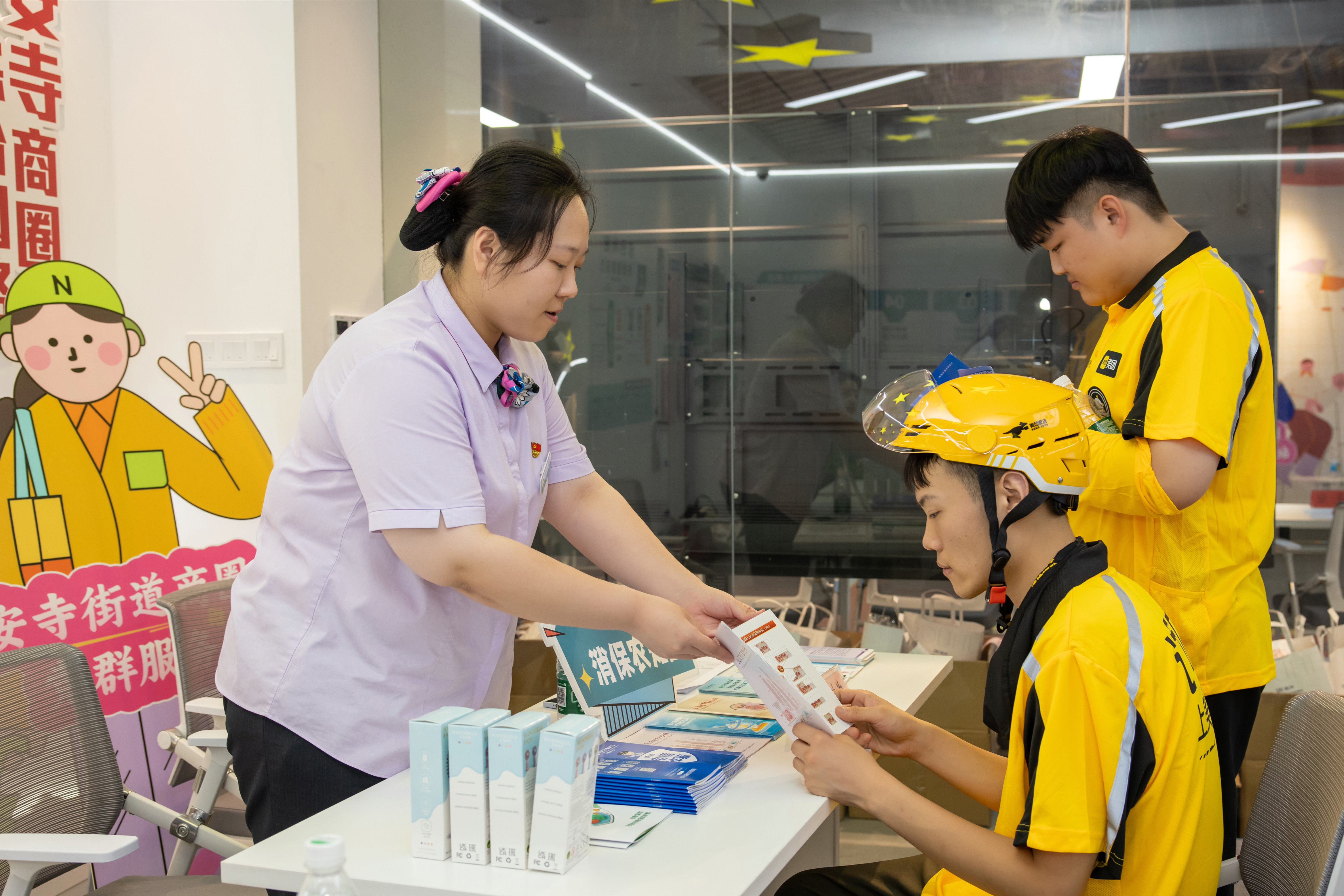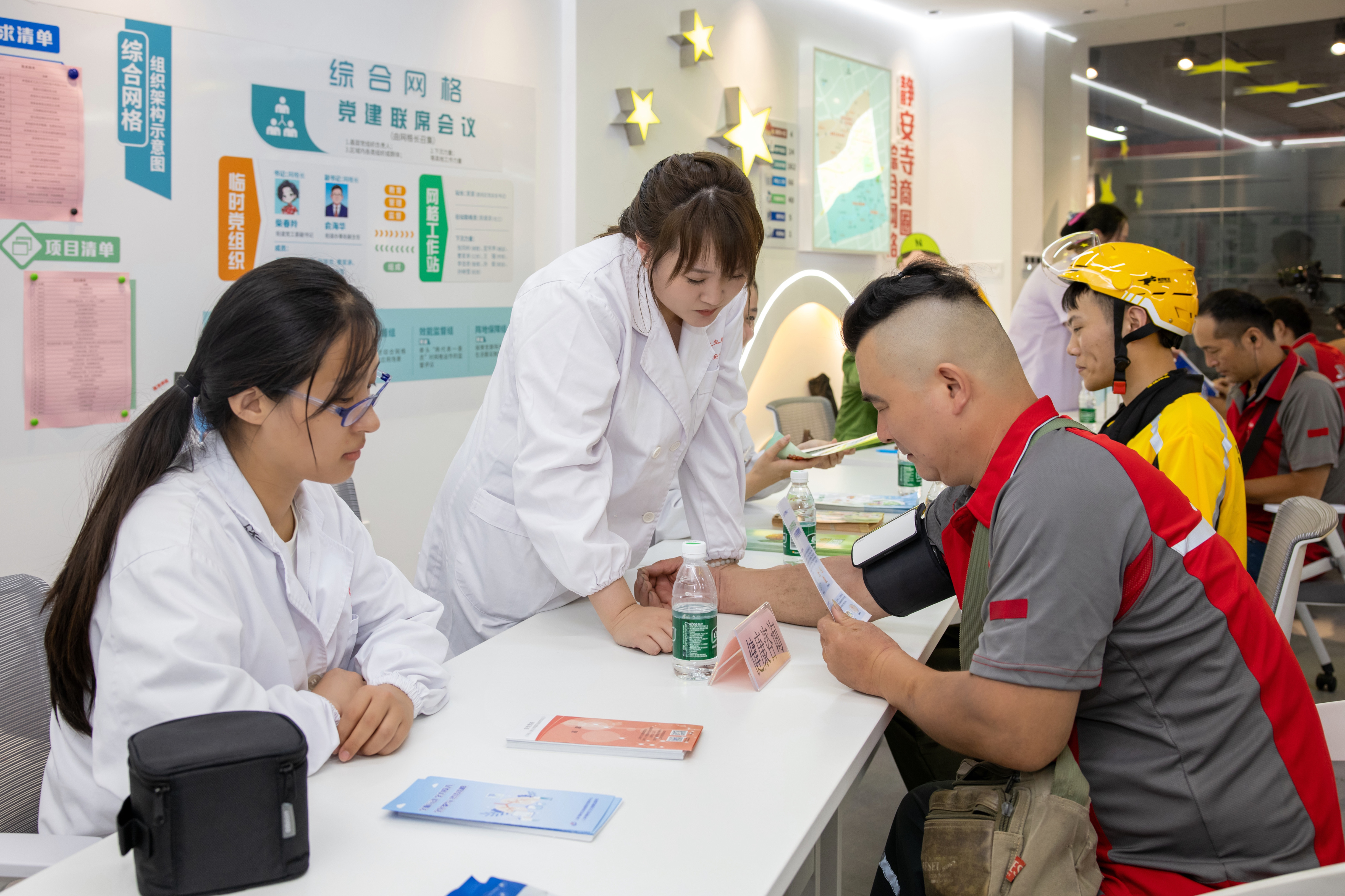 志愿服务集市也同时在商圈党群服务站内进行。街道党群服务中心、社区事务受理服务中心、社区卫生服务中心、银行、律所等部门和企业现场为骑手提供党务咨询、政务咨询、金融咨询、法律咨询、健康义诊等服务。热心社会服务的企业也主动为骑手们送上暖心好物:位于CP静安地下一层的祐禾面包还为此次活动捐赠了100份暖心面包,张有德老字号牛肉面为参加活动的骑手免费送上姜枣茶等饮品和小哥专属优惠券。