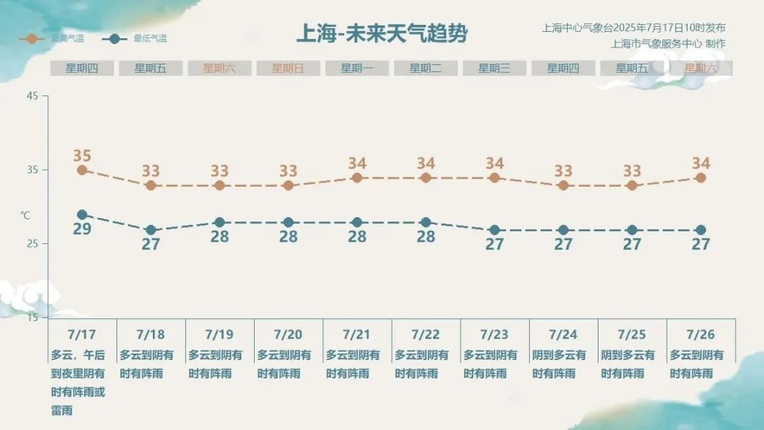 今日(7月17日)申城处在副热带高压边缘,天气以多云为主,午后到夜里转为阴有时有阵雨或雷雨,全天气温在29~35℃之间,加上相对湿度有所提升,形成“上蒸下煮”的闷热之感,又是“炎热+潮湿”的一天。