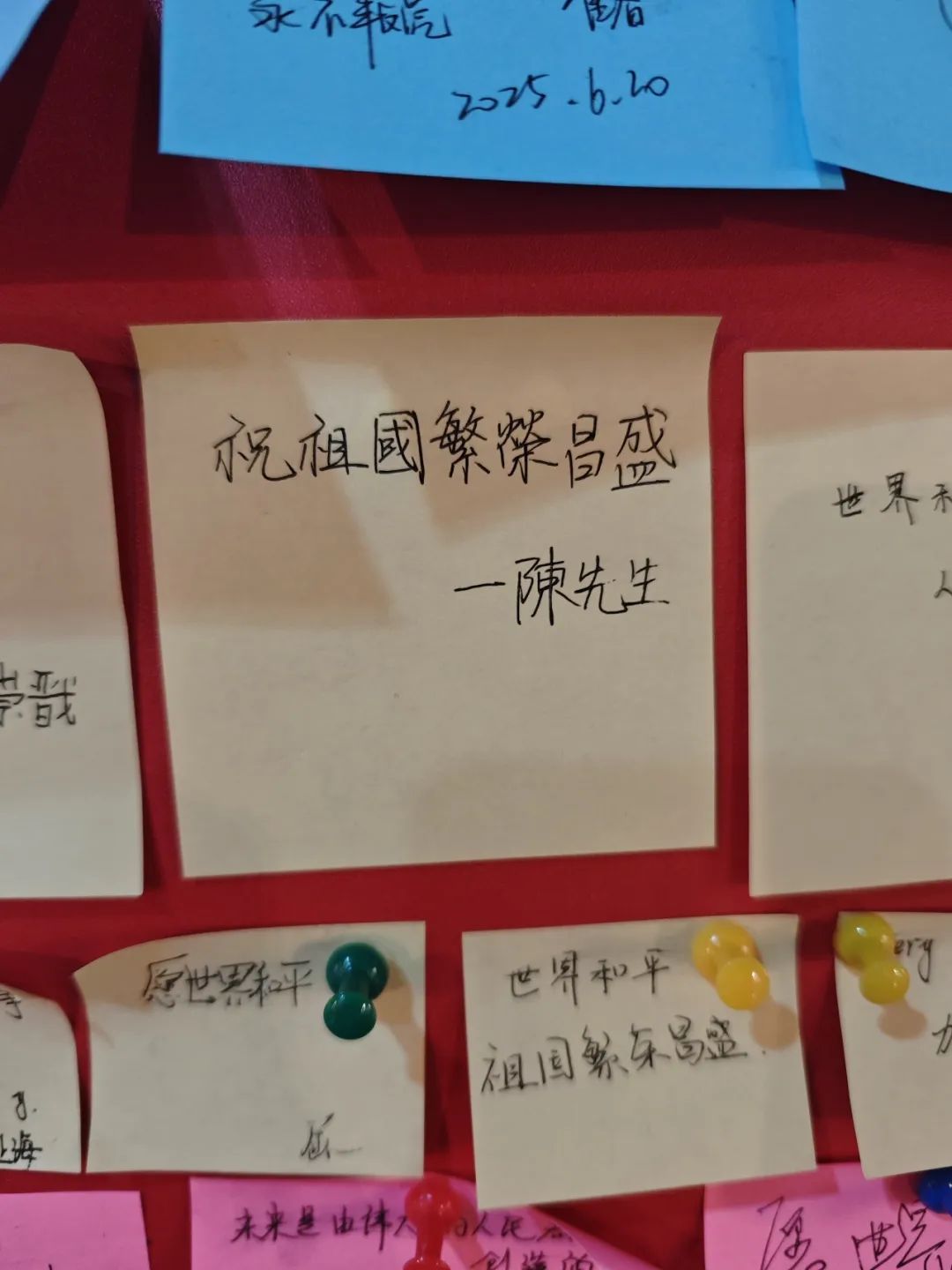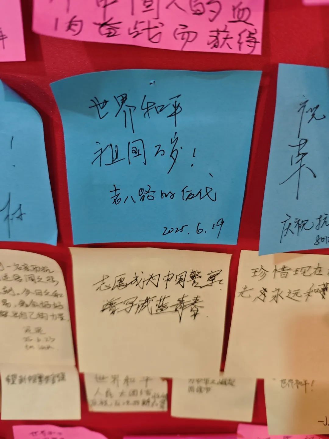 展厅出口贴满热心观众的留言,大家纷纷表达了对抗战纪念、不忘初心、祖国繁荣、世界和平的期许与希望。展览推出的3组印章也吸引了众多读者朋友前来集章、分享。