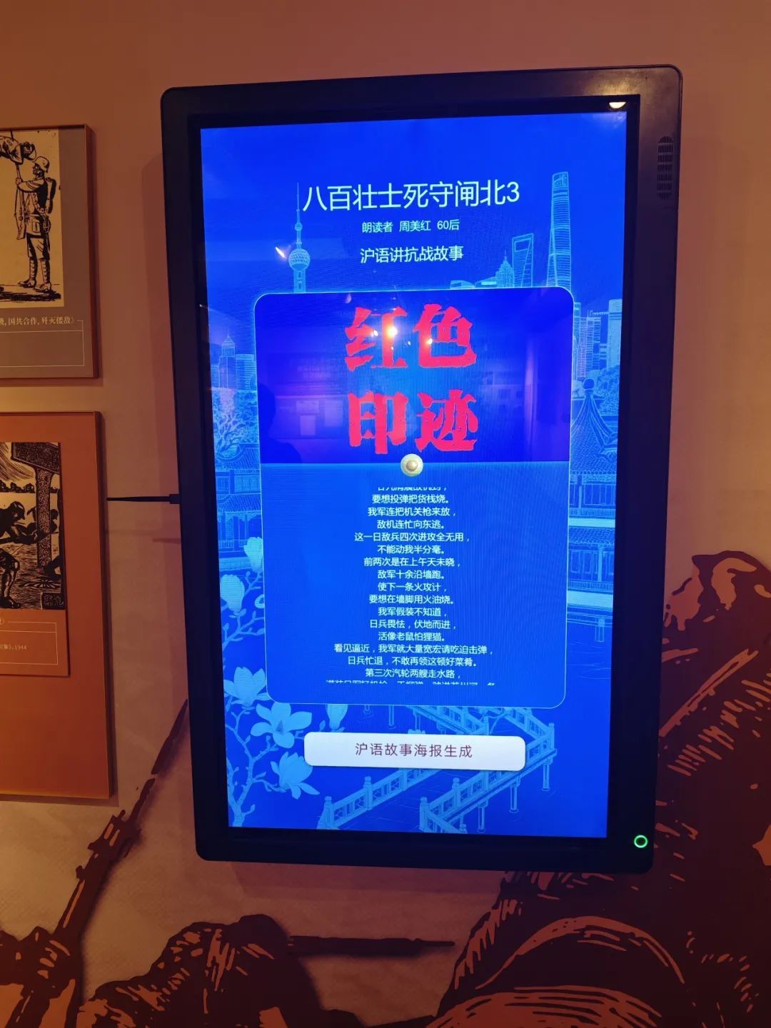 7月11日,展厅内“沪语讲抗战故事”多媒体展项新增历史读本《八百好汉死守闸北》《抗敌正气画集》故事片段。众多读者到展厅体验、聆听了从60后至10后不同年龄段的市民朋友用上海话还原的抗战历史文献。