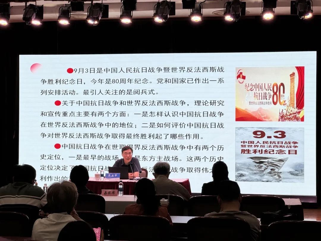 7月17日下午,展览主办方之一上海市文史资料研究会特邀华东师范大学终身教授齐卫平主讲“红色印迹”系列讲座第三讲《上海抗战文化的精神力量和当代意义》。齐教授从抗日烽火中的上海文化、抗日战争时期的上海文化人以及继承上海抗战文化遗产、建设文化强国实践三个方面,探讨了上海抗战文化的历史地位、发展过程及其对抗日战争的贡献与精神价值。上海抗战文化遗产充分彰显不畏艰险、勇往直前的精神力量,充分利用中华优秀传统文化资源宣传抗日,充分体现中华文化在抗战中的主体性坚守。弘扬上海抗战文化,对凝聚建设文化强国的磅礴力量具有重要现实意义。