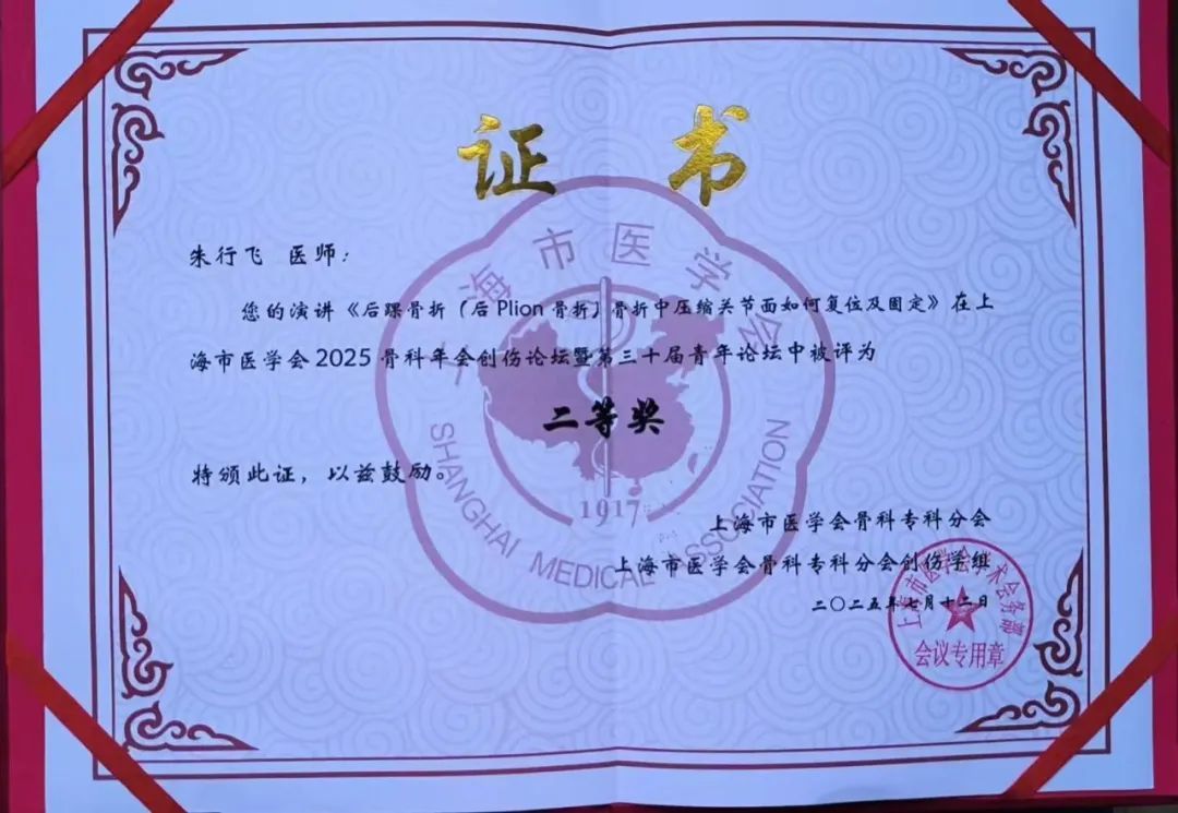7月11日至12日,一年一度的“上海市医学会骨科学术年会”在上海光大会展中心举行。作为权威的骨科学术盛会,本次大会汇聚沪上各大医院久负盛名的骨科资深教授及青年才俊,围绕全球骨科热点、焦点问题展开交流讨论,有力推动骨科学科的发展。 在本届大会的“未来大师之路”--第30届创伤骨科青年医师论坛上,同济医院骨科主治医师朱行飞博士,在骨科副主任、创伤骨科主任樊健教授的指导下,带来了题为“后踝骨折(后Pilon骨折)压缩关节面如何复位及固定”的精彩演讲,凭借聚焦临床痛点、内容扎实、逻辑严谨、答辩出彩的优秀发挥,荣获青年医师论坛二等奖,上海市医学会骨科分会创伤学组组长纪方教授亲自颁奖。据悉,本次青年医师论坛设一等奖1名、二等奖2名、三等奖3名。此次获奖不仅是对朱行飞医生个人学术水平的认可,也彰显了同济医院骨科对青年医生培养工作的重视和成效。
