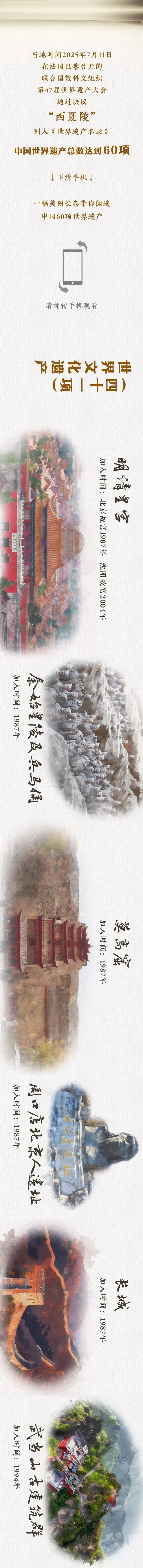当地时间2025年7月11日,在法国巴黎召开的联合国教科文组织第47届世界遗产大会通过决议,将“西夏陵”列入《世界遗产名录》。至此,中国世界遗产总数达到60项。