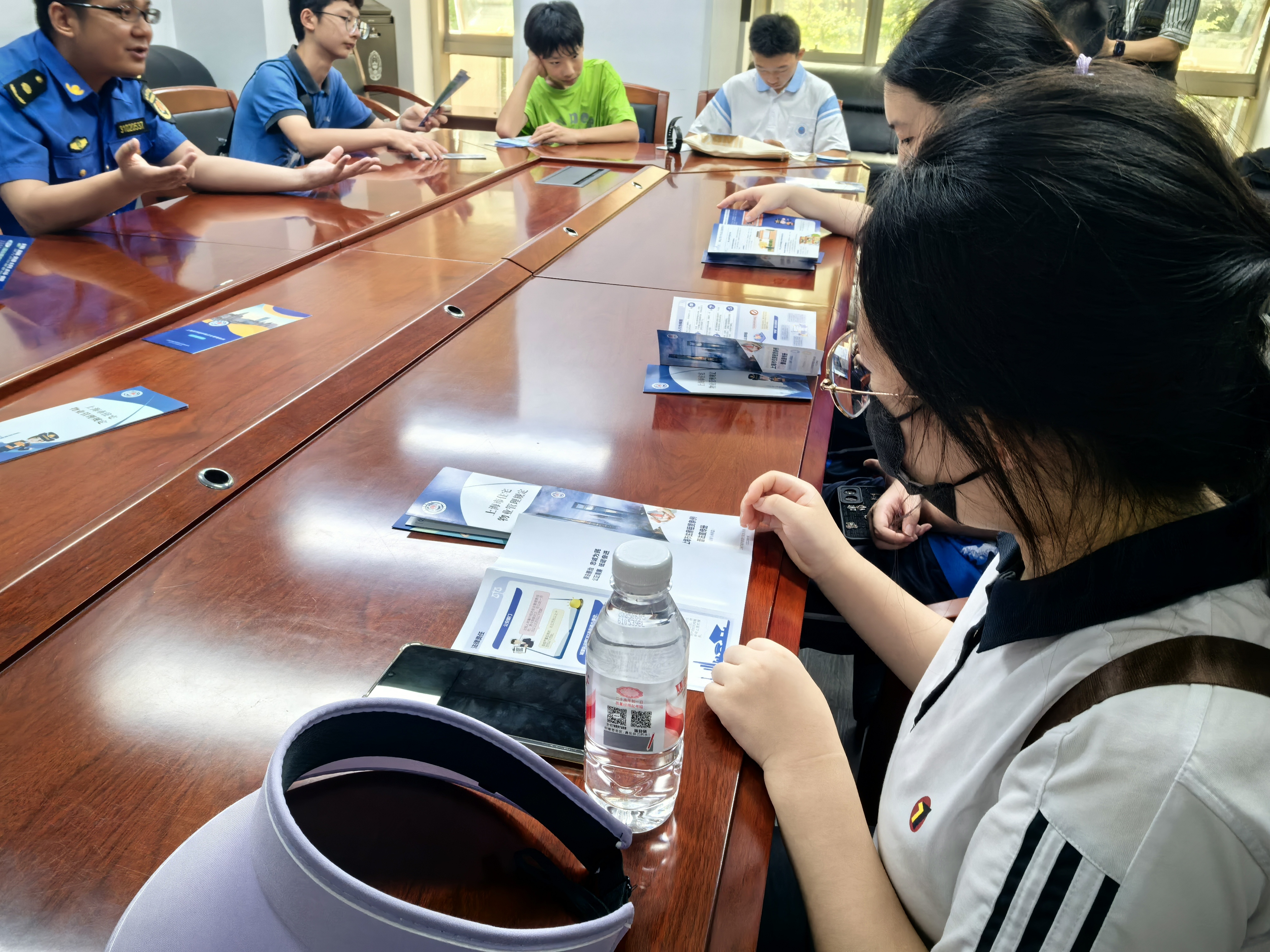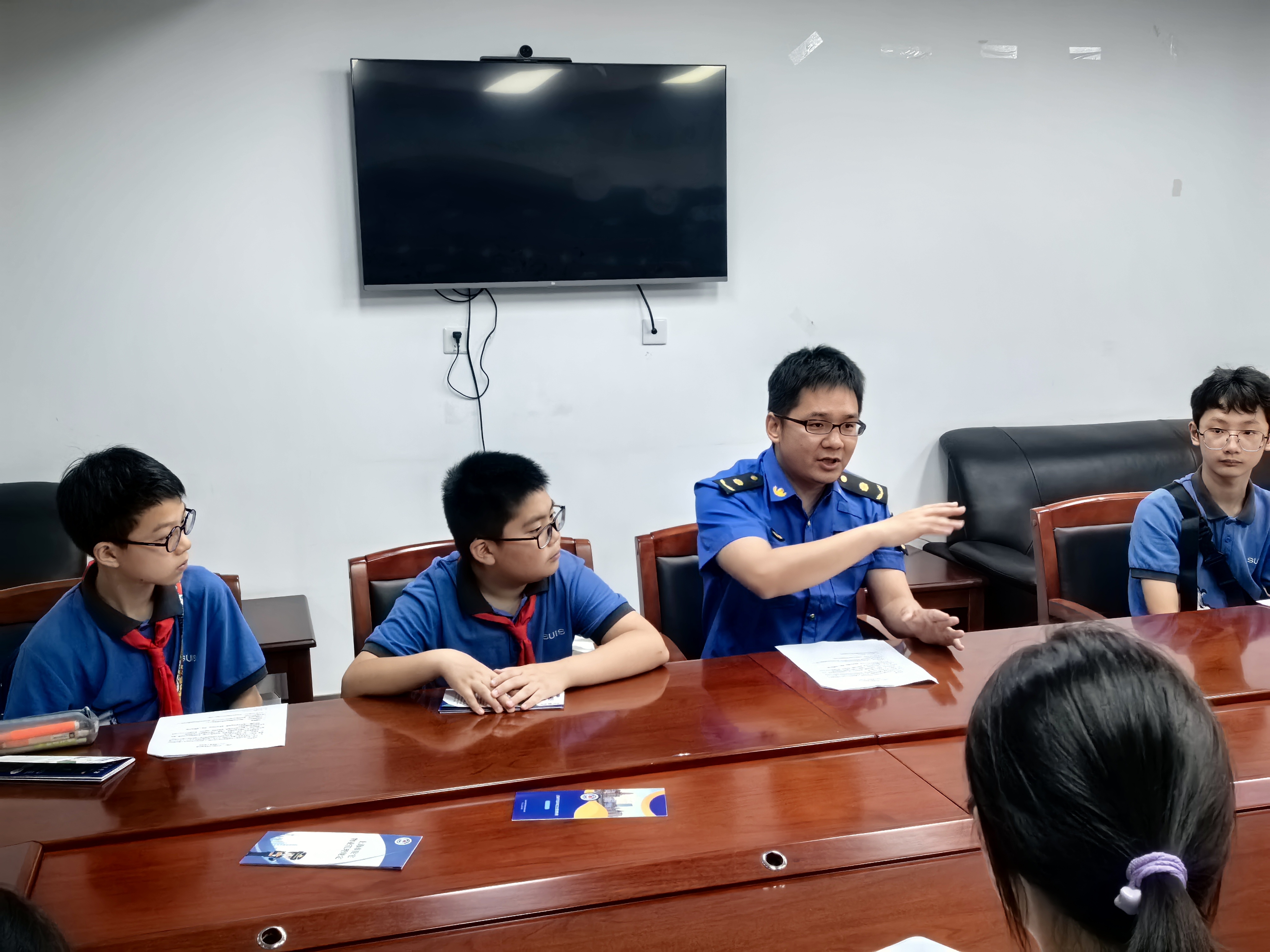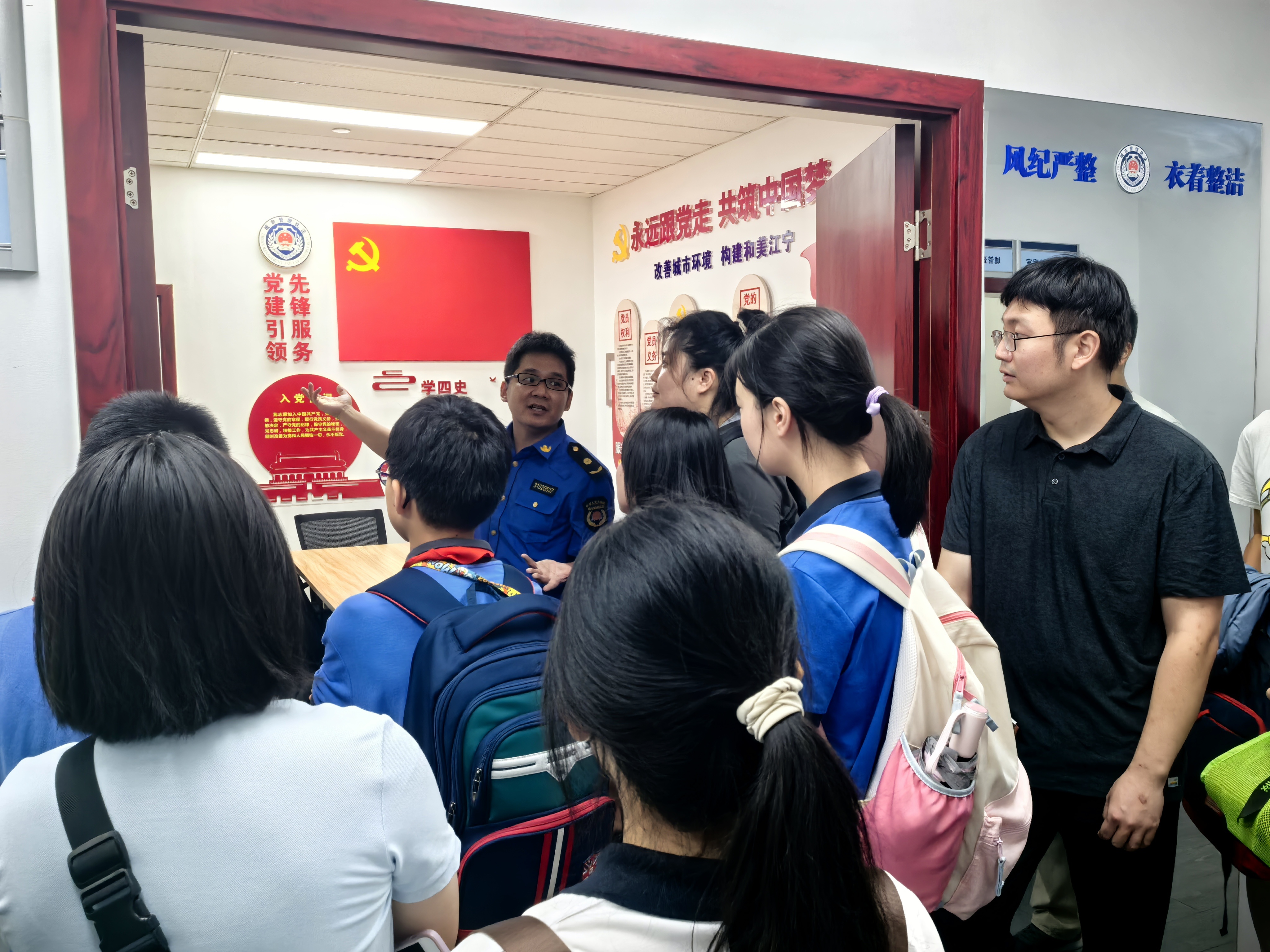 7月14日,辖区暑托班的20多名学生化身 “小小城管员”,走进江宁路街道综合行政执法队,开启了一场别开生面的职业体验。穿过刻有“崇法善治 忠诚为民 公正清廉 砥砺奋进” 标语的走廊,孩子们依次参观了中队的受理室、勤务指挥室、办公室、文书档案室等;档案柜里按年份分类的卷宗记录着城市治理的点滴细节。执法队员特意抽出两本典型案例档案,带着孩子们逐页翻看。“这是商户跨门经营的整改通知书,上面有执法时间、整改要求,还有商户的签字确认的回执哦。”当看到档案里附的现场照片从“杂乱堆放”变成“整洁有序”,大家忍不住感叹执法工作对城市环境带来的改变。