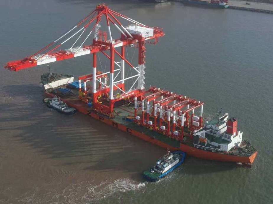 本次卸下的桥吊重2000多吨,前大梁70米,中梁35米,后梁20米,抓箱装置可行走区间超120米。海侧前大梁长度可覆盖目前世界最大级别集装箱船舶的宽度,再大的船舶靠港也能应对自如。