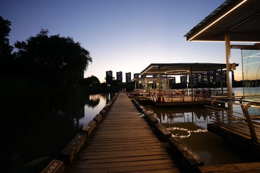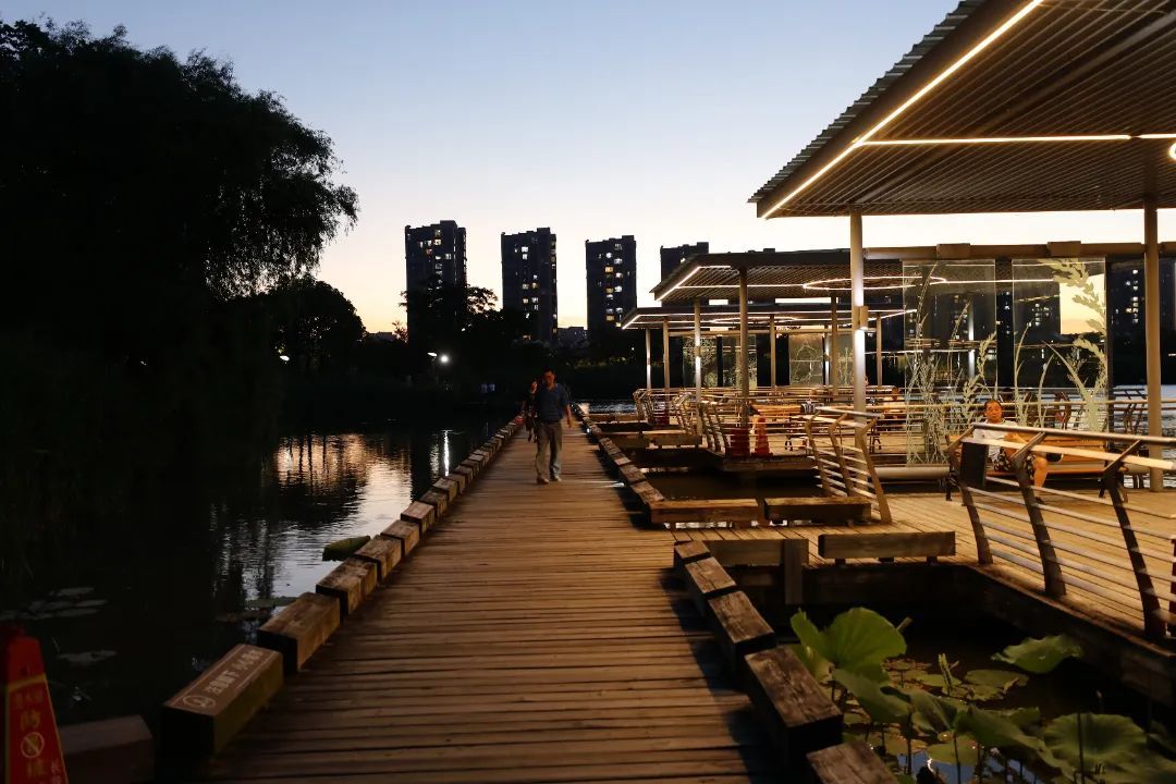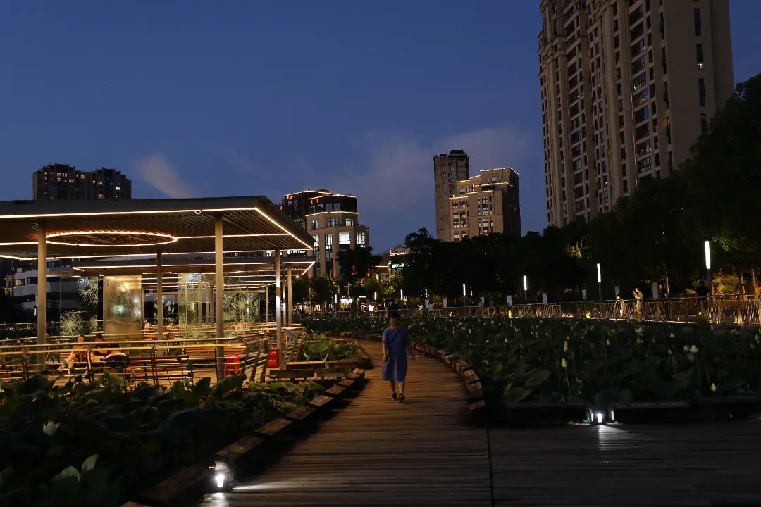 沿着环湖步道慢行,晚风裹挟荷香拂面,栈道两侧的灯带勾勒出蜿蜒的曲线,偶有夜鹭掠过水面,惊起一圈涟漪。