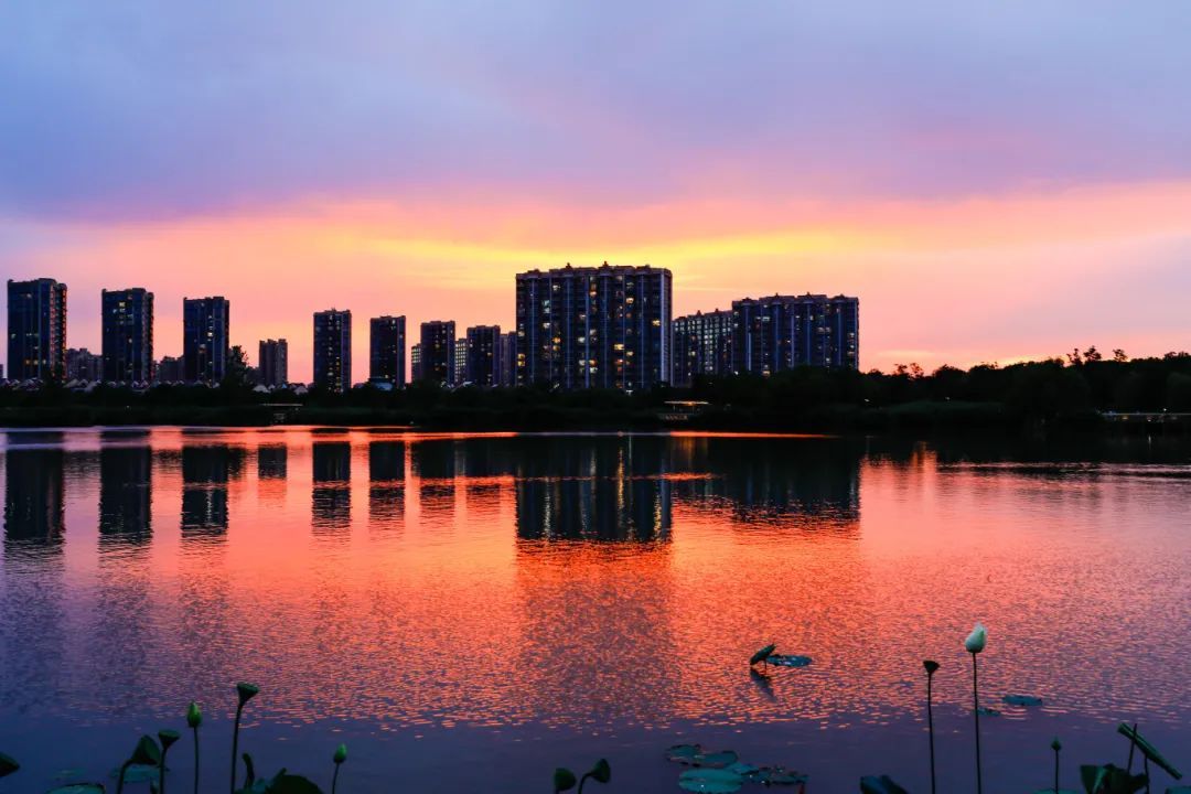 日落后,留云湖湖面倒映着远处高楼的点点灯火和灿烂晚霞,美得像一幅油画。