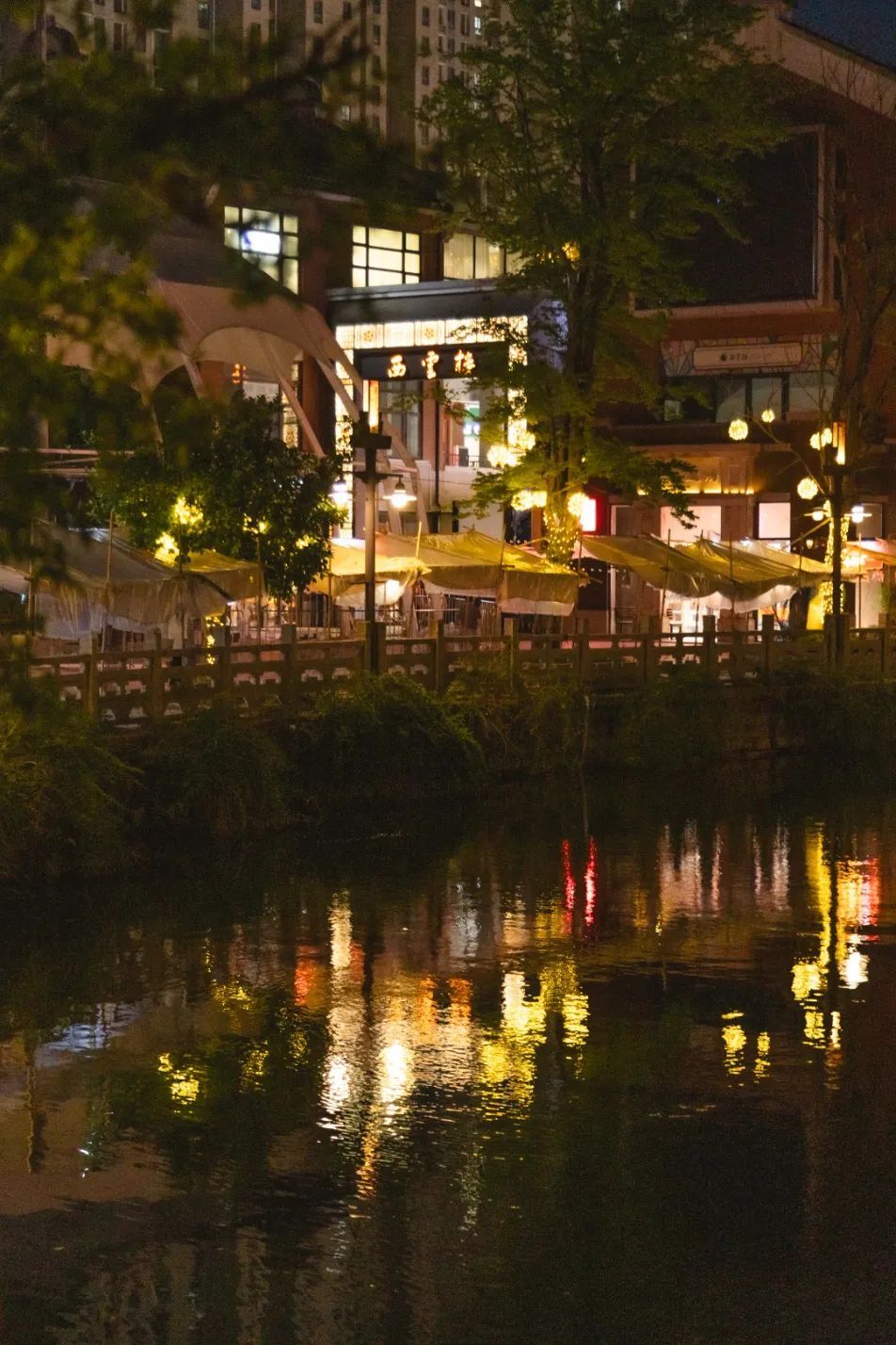 夜色中的留云湖,没有古镇的鼎沸人声,只有疏朗的树影与粼粼波光,恰是城市中难得的静谧诗行。
