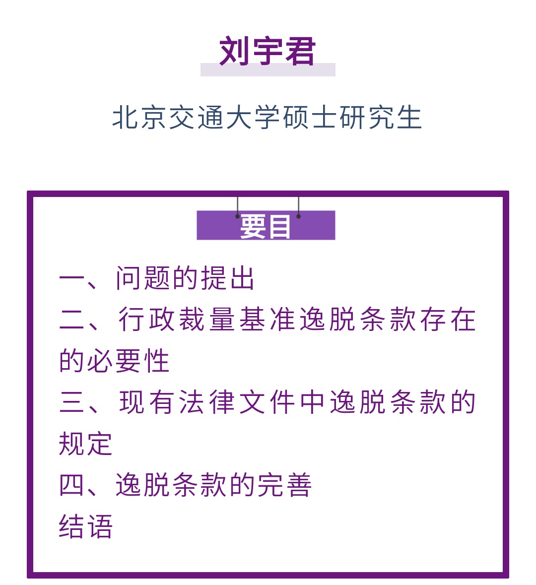 综观针对各种行政行为制定的裁量基准,逸脱条款已经崭露头角,走进行政裁量基准的文本中。一方面可能基于行政裁量基准制定者未雨绸缪的智慧,另一方面也显现出现实对逸脱条款的需要。逸脱条款应当在行政裁量基准的制定中得到更加广泛的承认,将逸脱条款构建为行政裁量基准的一部分,通过逸脱条款完善行政裁量基准。