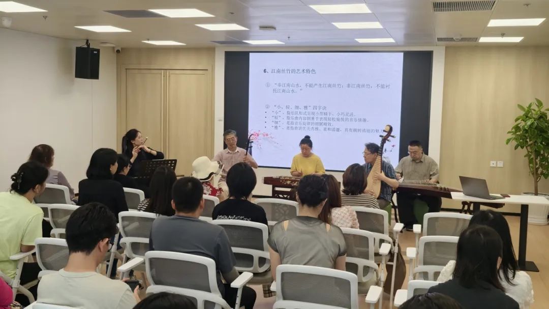 活动中,上海国乐研究会副会长何小栋担任主讲嘉宾,他以图文并茂的形式,为现场观众展开了一幅江南丝竹的历史长卷:从西周“八音”中便已存在的“丝竹”元素,到先秦《礼记·乐记》中“金石丝竹,乐之器也” 的记载;从明清时期在民间蓬勃发展的“清音”“仙乐”,到1952年“江南丝竹”名称的正式确立,再到2006年成为第一批国家级非物质文化遗产——脉络清晰的讲解,让听众对这门传统艺术的渊源有了系统认知。