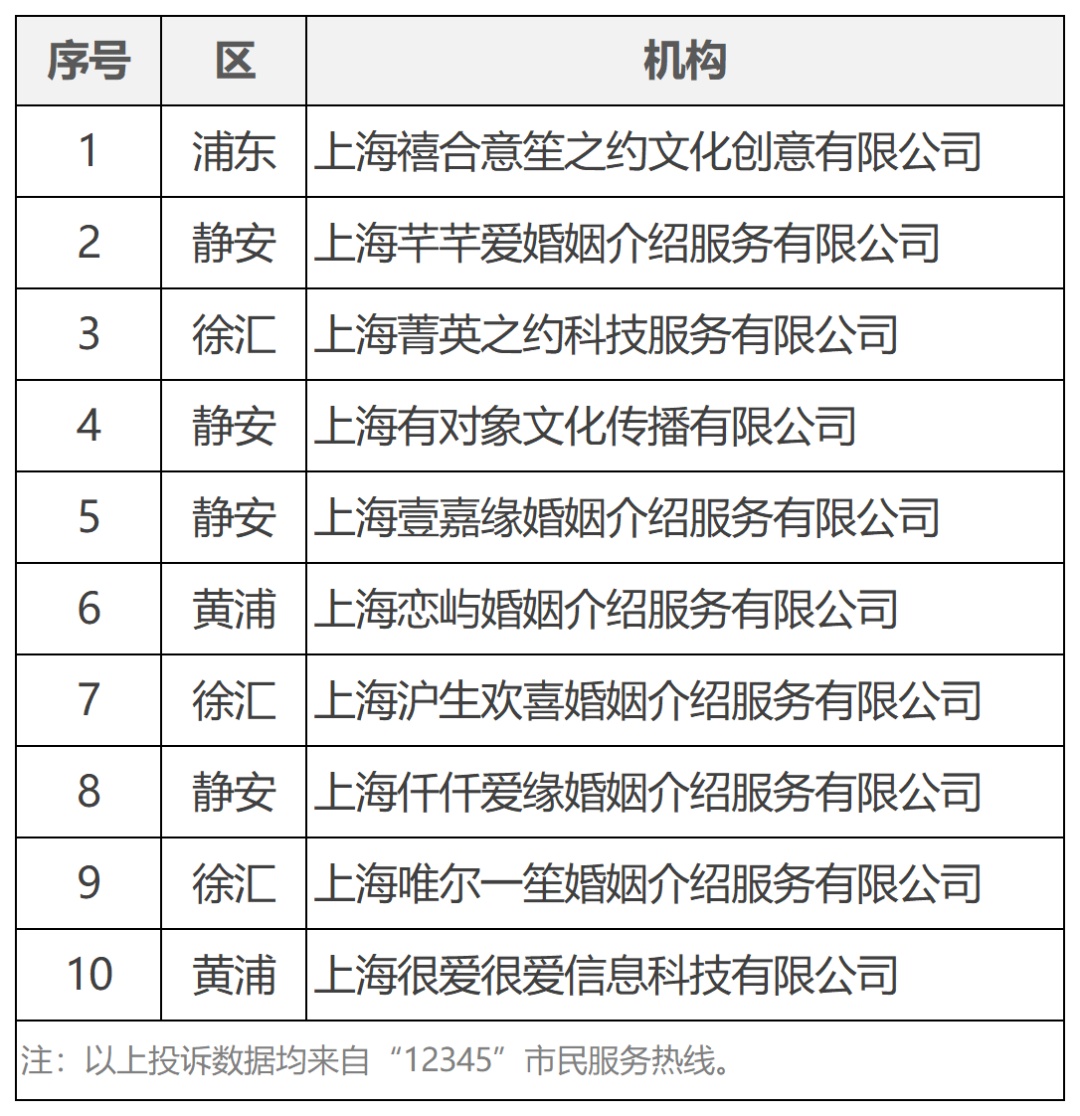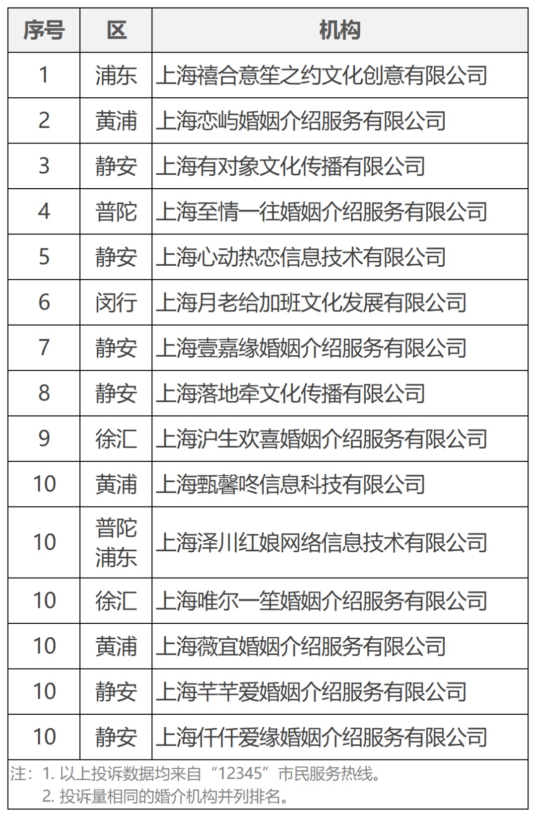 为进一步规范婚介行业诚信经营,提升婚介机构服务质量,市婚姻介绍机构管理协会现公布本市2025年6月及1-6月实体门店投诉量前十的婚介机构名单,具体名单如下: