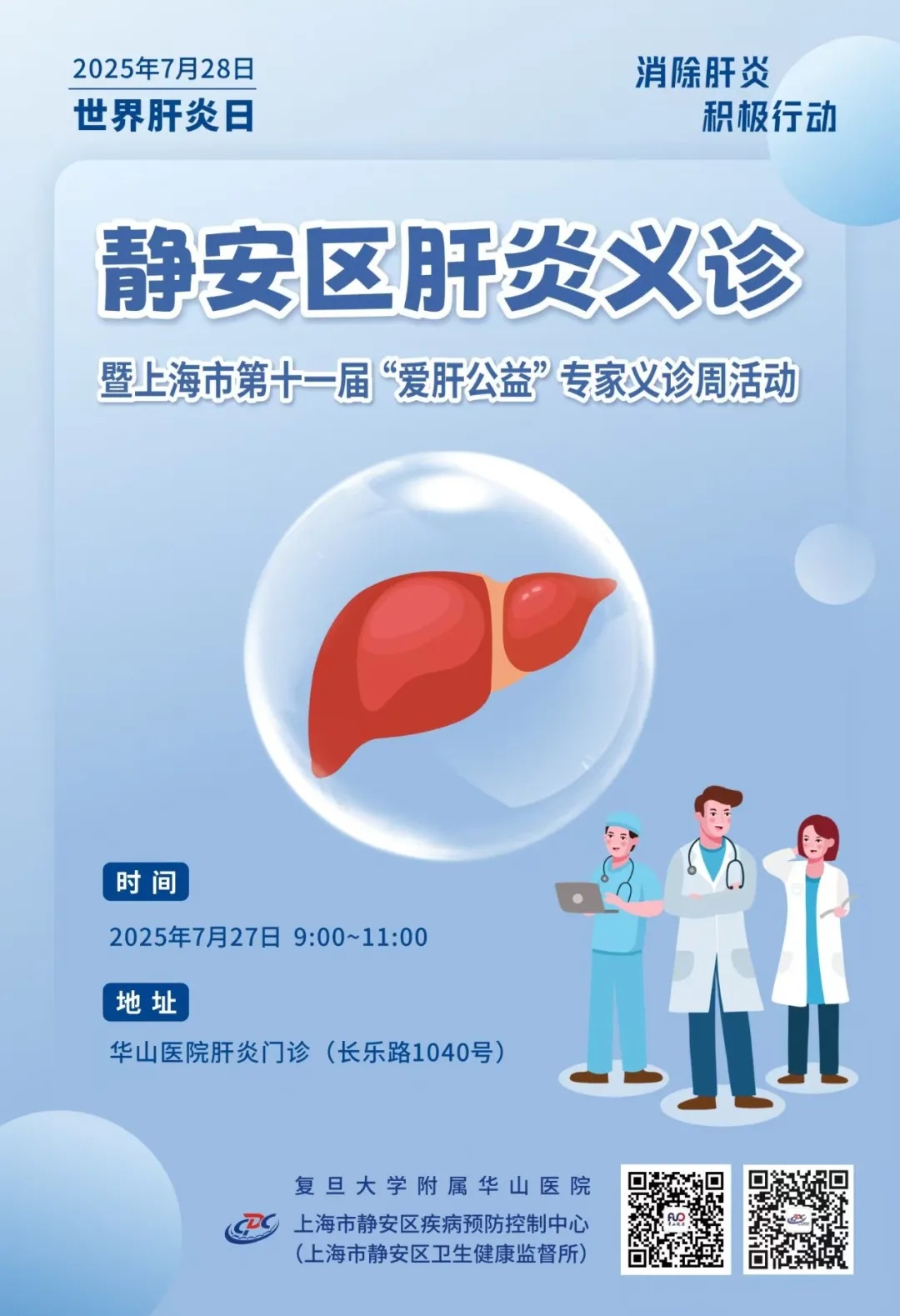 关注肝脏健康,从我做起,做自己健康的第一守护人。2025年7月27日9:00-11:00华山医院肝炎门诊,我们在静安区肝炎义诊现场等您!