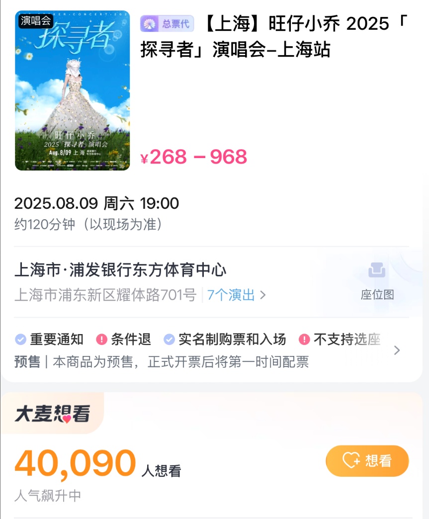 目前,上海演唱会已经开票,大麦显示有4万多人标记想看,票价区间在268-968元。
