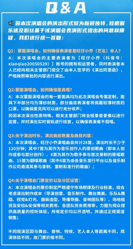 对此,旺仔小乔回应蒙面演唱会争议称,在网上发歌的初衷就是希望大家可以听到自己的声音,因为声音关注自己,这样会更纯粹,也希望网络和生活可以分开,出去玩不用担心太多。并称虽然国内没有不露脸开演唱会的先例,但国外已经有很多了,自己也想尝试一下。