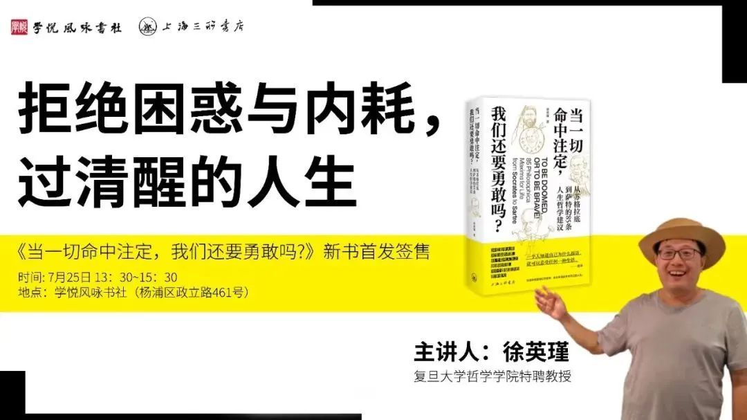 7月25日(周五)13:30,学悦风咏书社,明星哲学教授徐英瑾携新书《当一切命中注定,我们还要勇敢吗?》为大家解惑,帮助你找到最适合自己的人生哲学。