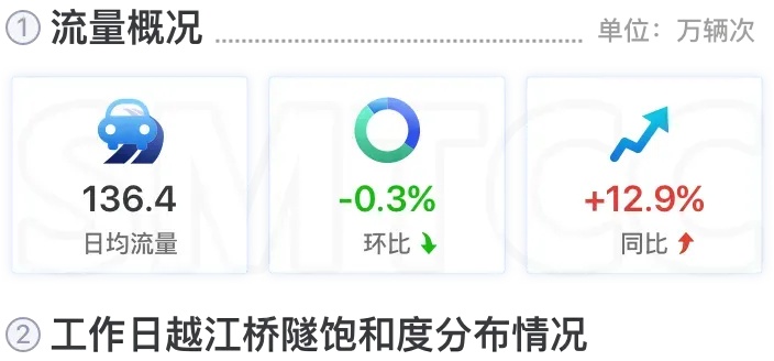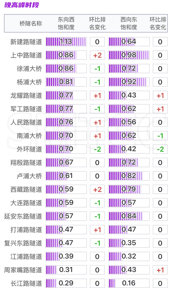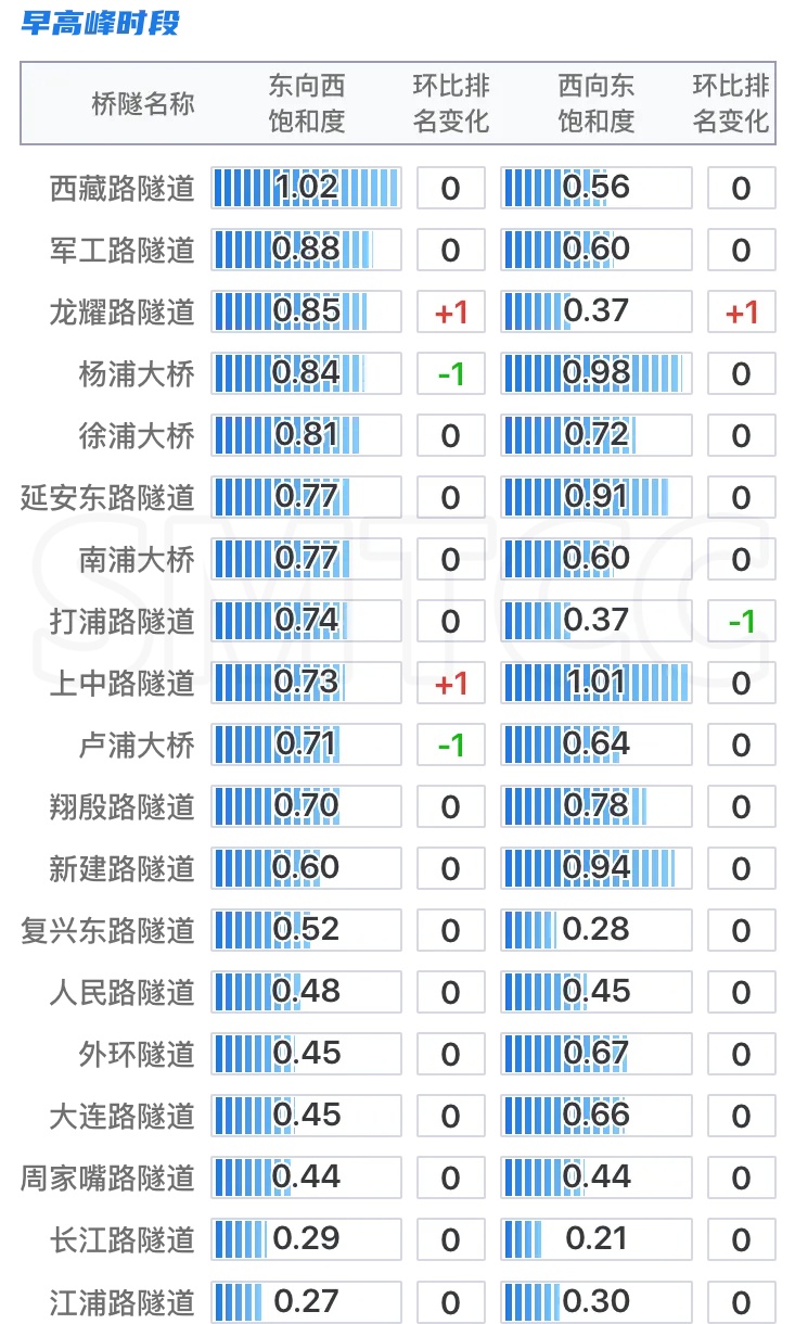 越江桥隧饱和度排名环比较稳定。早高峰时段,西藏路隧道东向西、上中路隧道西向东饱和度排名第一;晚高峰时段,新建路隧道东向西、上中路隧道西向东饱和度排名第一。