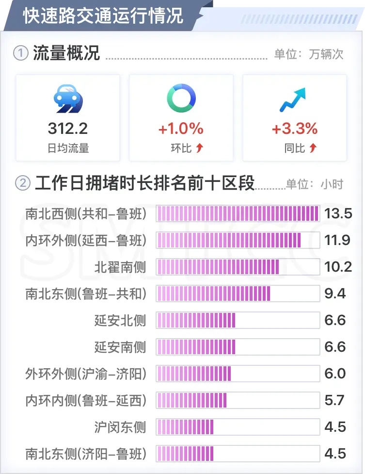 快速路工作日拥堵状况较5月和去年同期有所加剧,日均累计拥堵时长环比、同比分别增加4.5小时、26.6小时,但早、晚高峰拥堵情况缓解明显,道路交通指数环比、同比降幅均达到或超过10%。