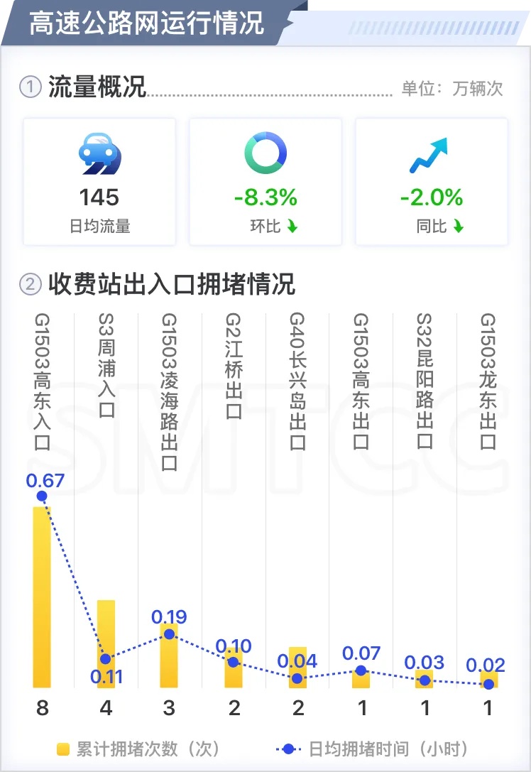 高速公路拥堵状况较5月和去年同期均缓解明显,日均拥堵时长分别减少1.9小时、4.2小时。6月有8个收费站出入口出现过拥堵,工作日易在7-10时出现拥堵。G1503高东入口拥堵次数和日均拥堵时长均位居第一,其中日均拥堵时长较5月减少1.6小时。