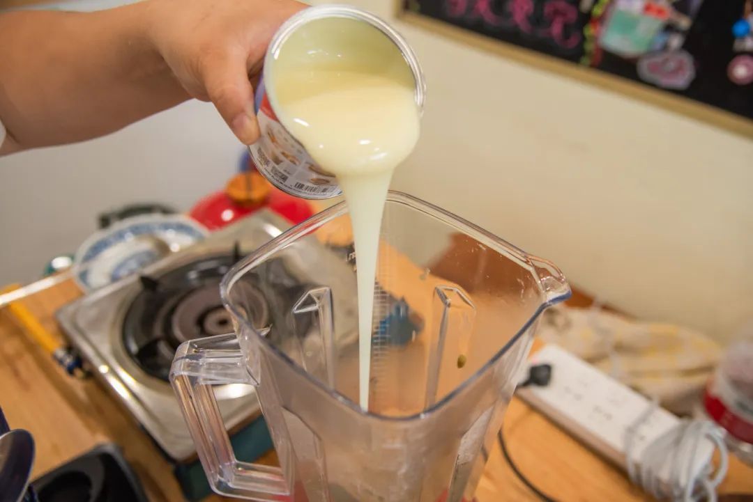 6.加入适量的纯净水与炼乳,搅拌2分钟。